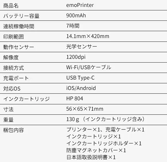 emoPrinterは900mAhの大容量バッテリーを搭載しているため、フル充電すると最大7時間の連続稼働が可能!大容量インクカートリッジ付き、標準モードでは415枚のA4用紙を印刷できます。