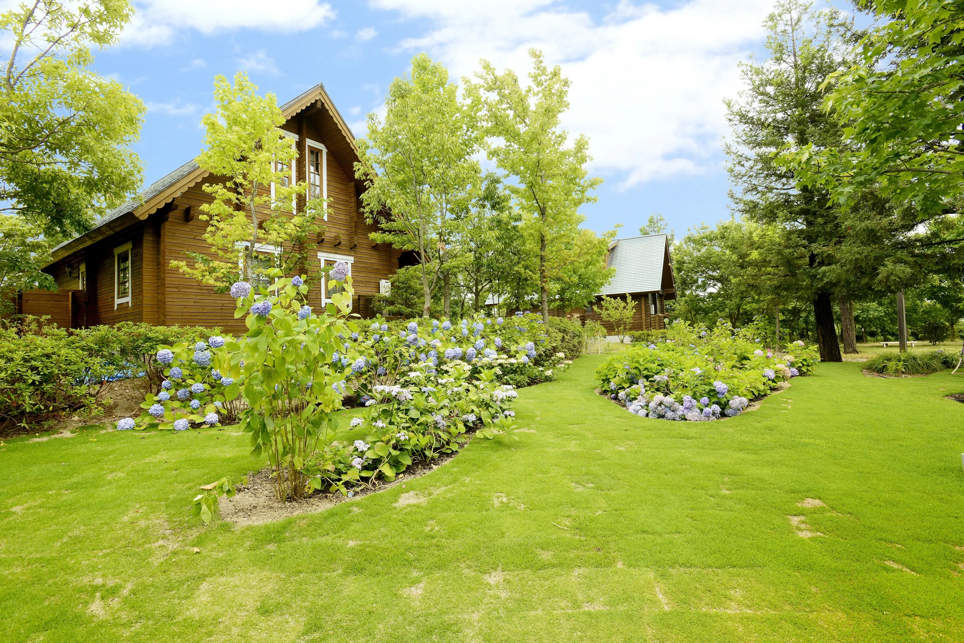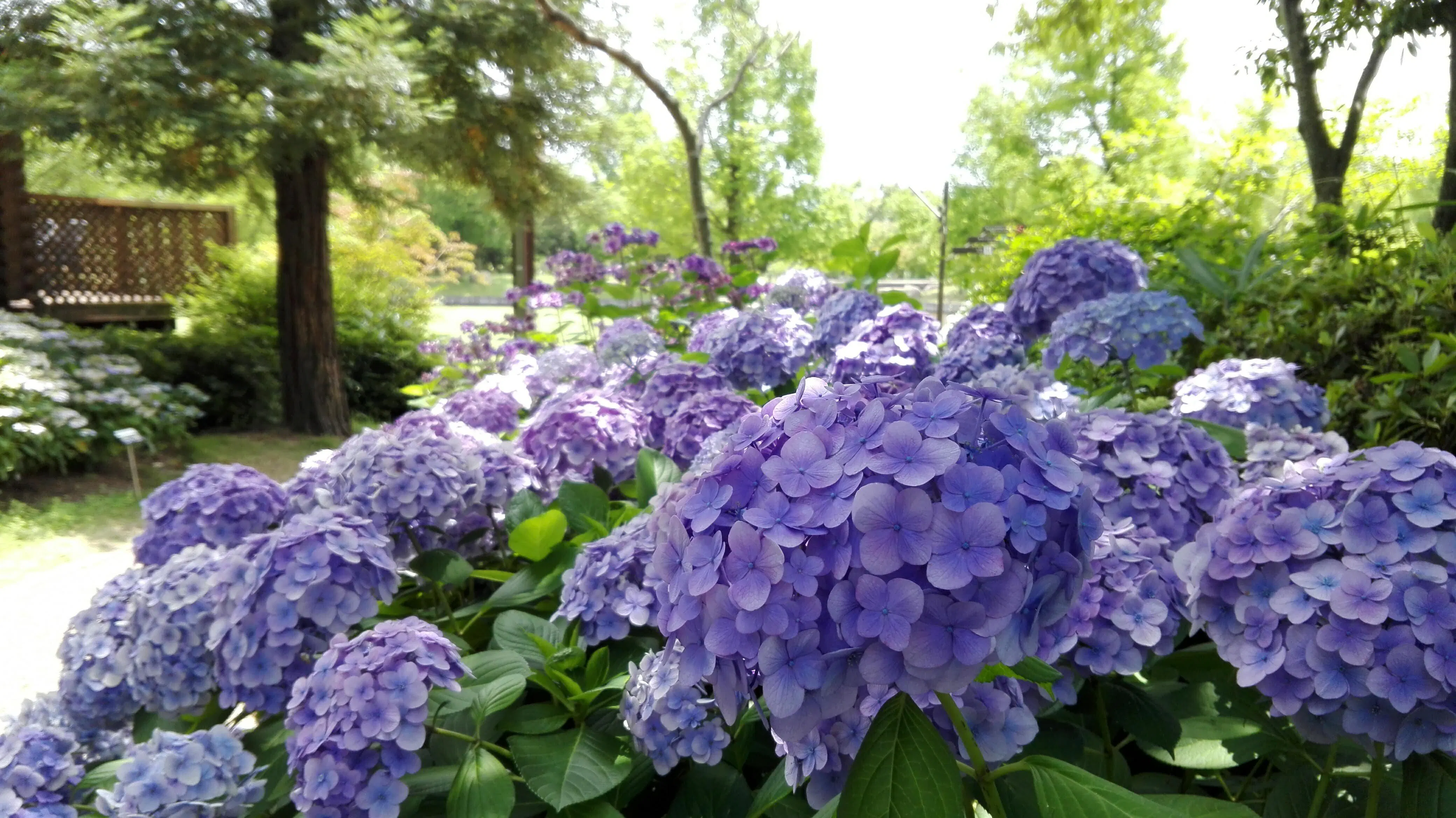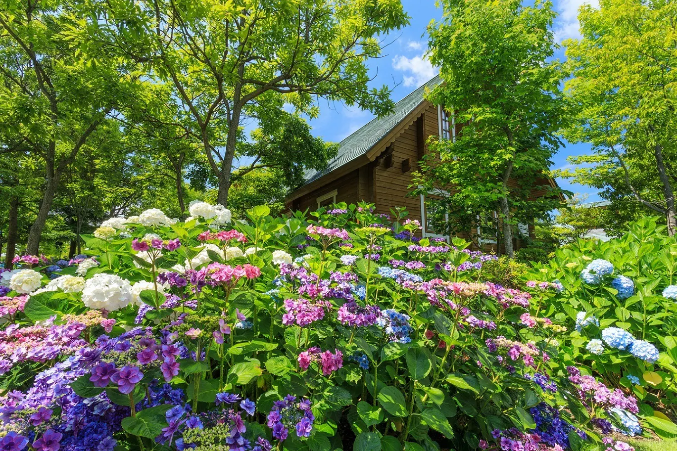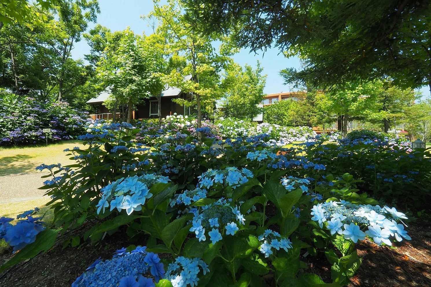 私たちホテル・ロッジ舞洲では例年、5月末から7月初旬まで「あじさい展」と題し、紫陽花の庭を一般開放しております。ログハウスが建ち並ぶ広々とした庭。紫陽花が咲き誇る光景は、まるでおとぎの国に舞い込んだ感覚になります。