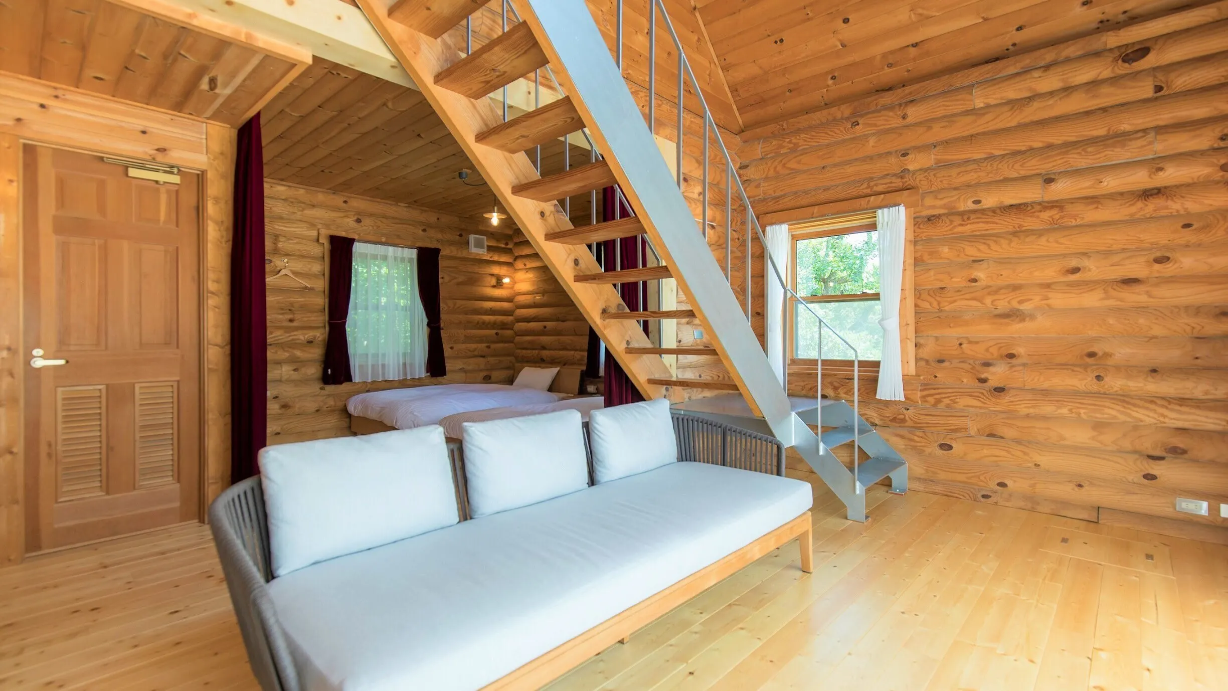 ・海外から輸入した本格的なログハウスで、リビング&キッチン付きの2階建てです。
