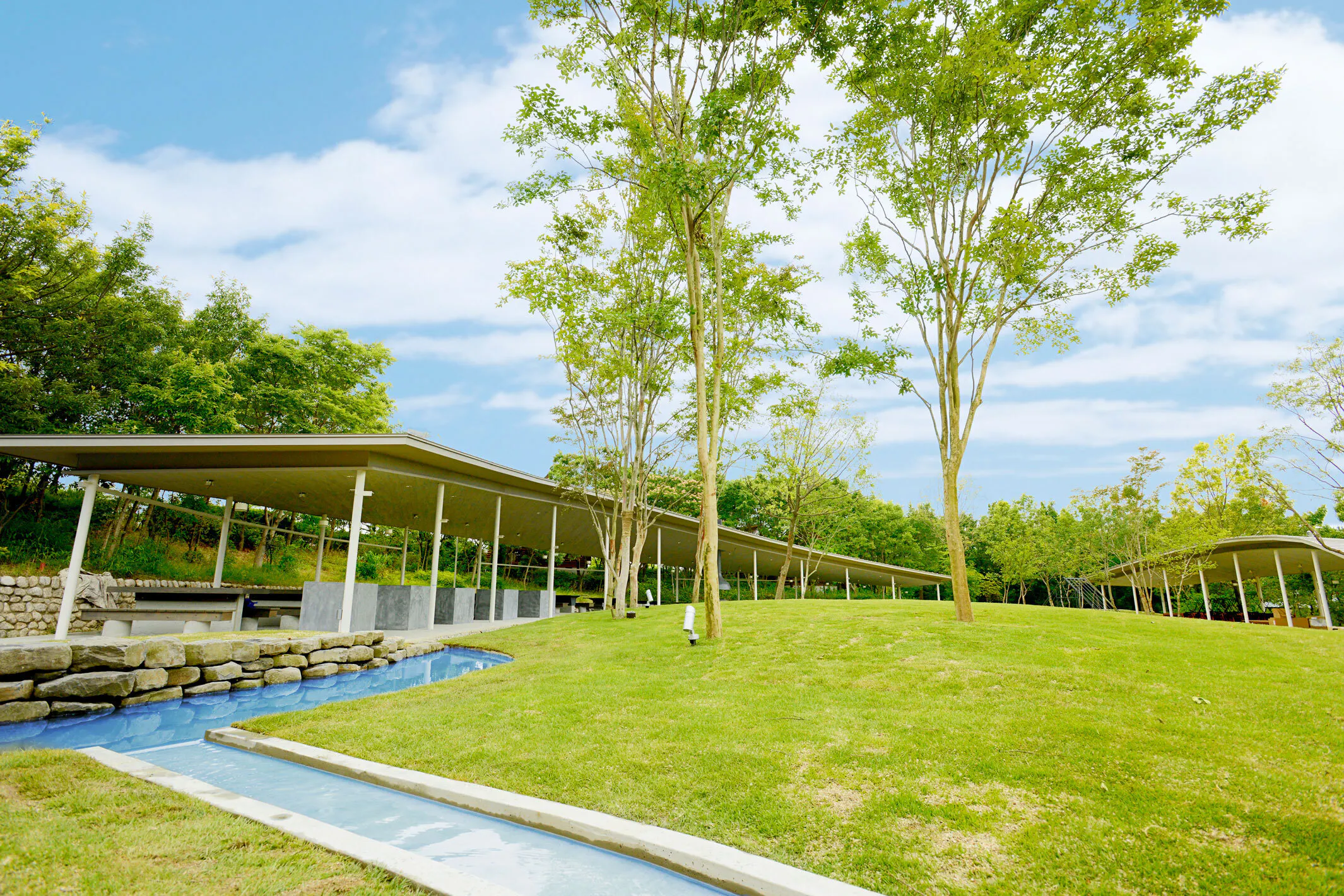 庭の奥には、バーベキュー施設「森とリルのBBQフィールド」。テラスに屋根が付いた全天候型です。芝生の丘に小川がせせらぎ、心安らぐ広場です。食材の持ち込み利用もOKですが、メニュー充実の手ぶらプランがおススメです。