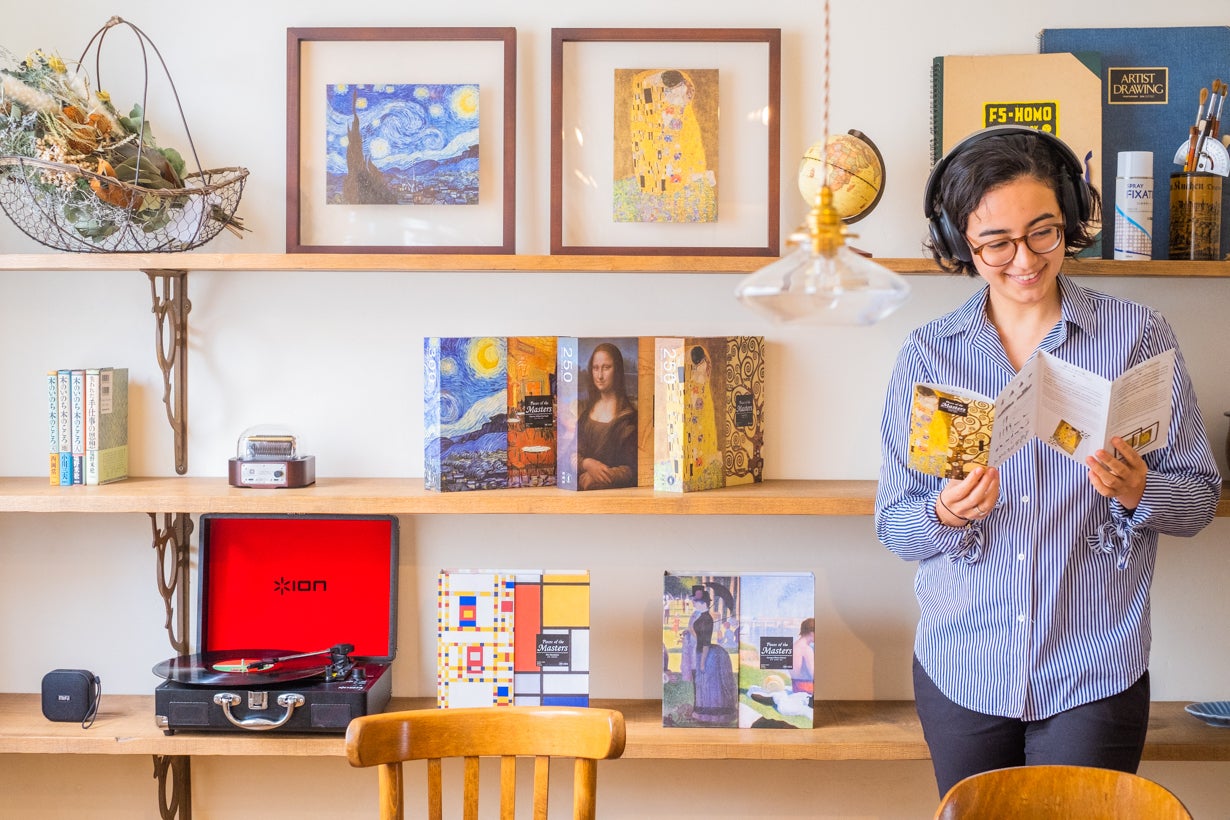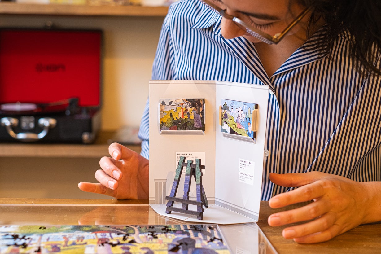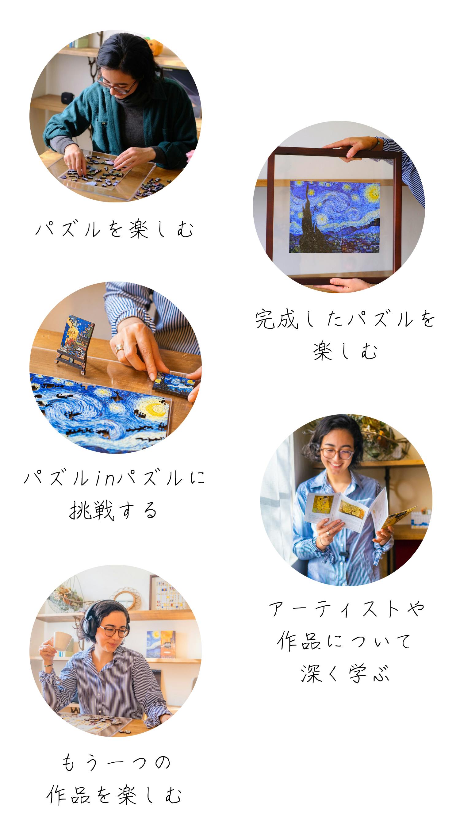 A:アーティストや作品の解説に加え、それにちなんだピースの解説やパズルの完成図、パズル in パズルの組み立て方の解説などを記載しています。