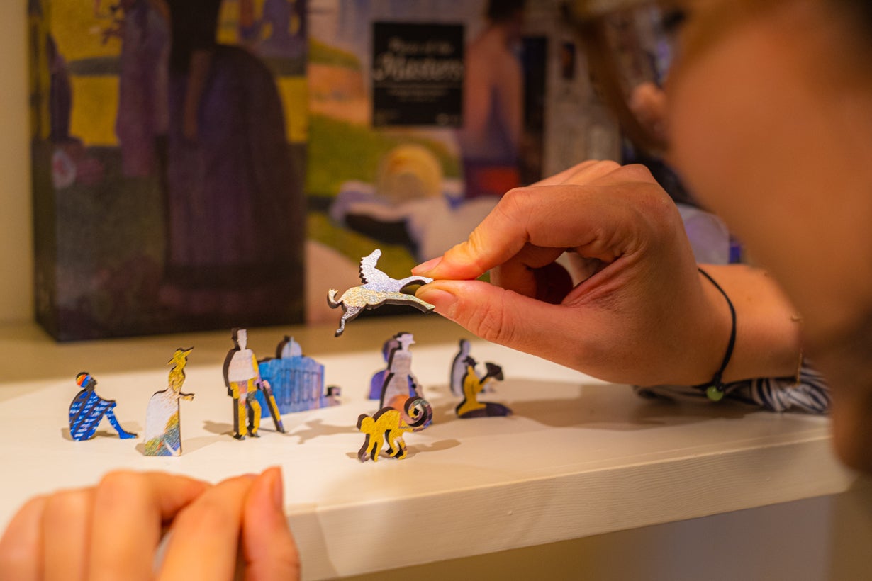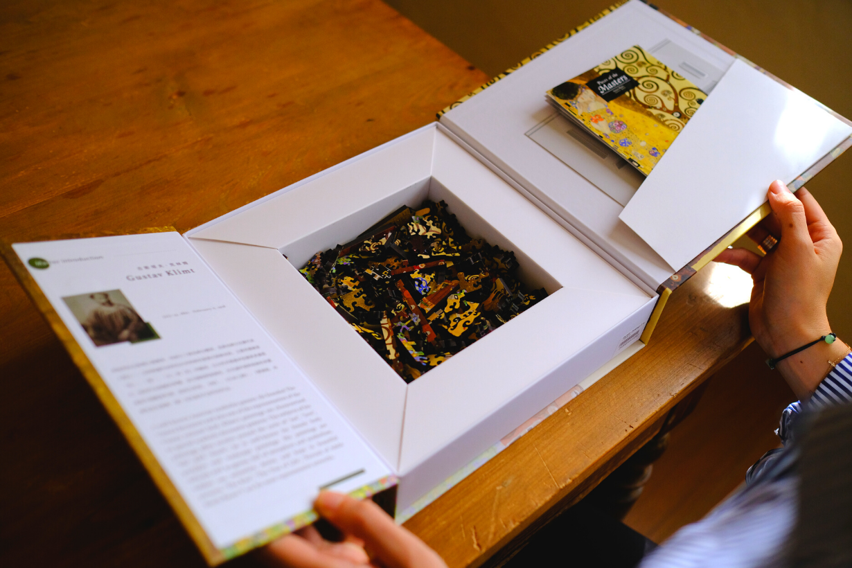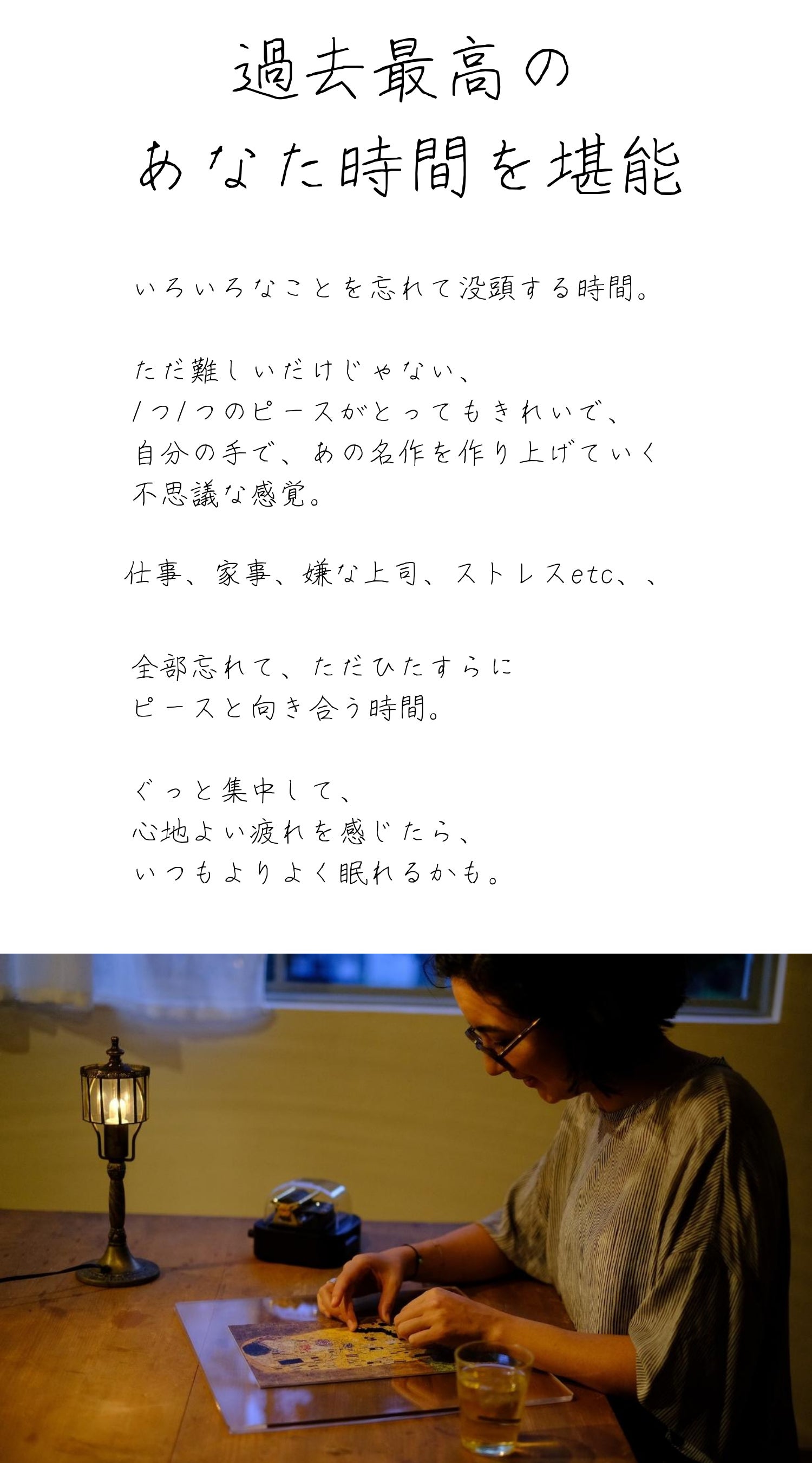 A:アーティストや作品の解説に加え、それにちなんだピースの解説やパズルの完成図、パズル in パズルの組み立て方の解説などを記載しています。
