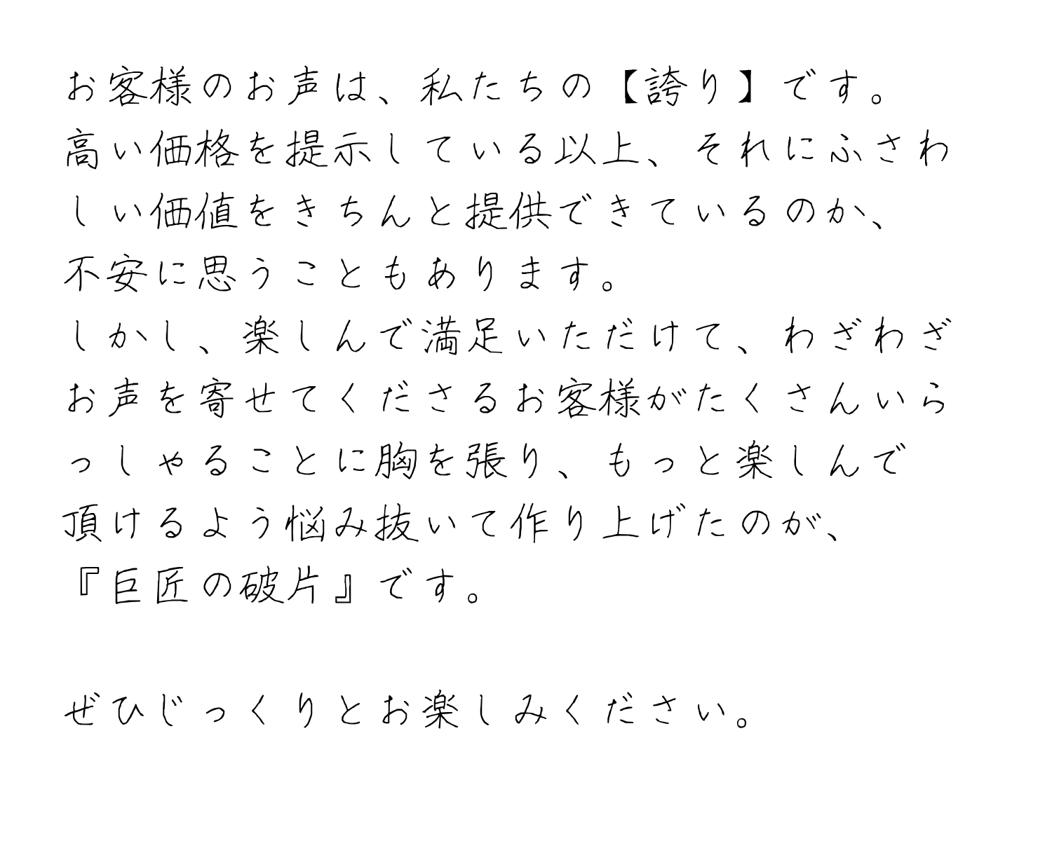 ・予想以上のご注文また社会情勢の変動により製造期間が延びお届け時期が遅れる場合があります。巨匠の破片は丁寧に時間をかけて生産をしているため、想定を超える多くのご支援を頂いた場合は生産に多くの時間がかかってしまいます。