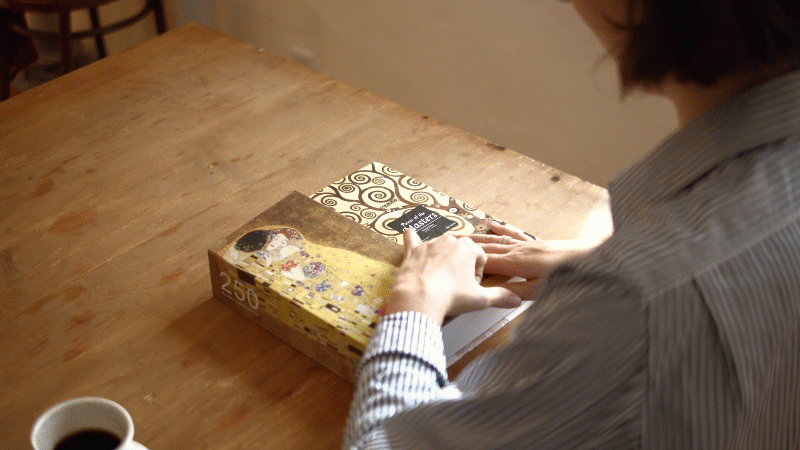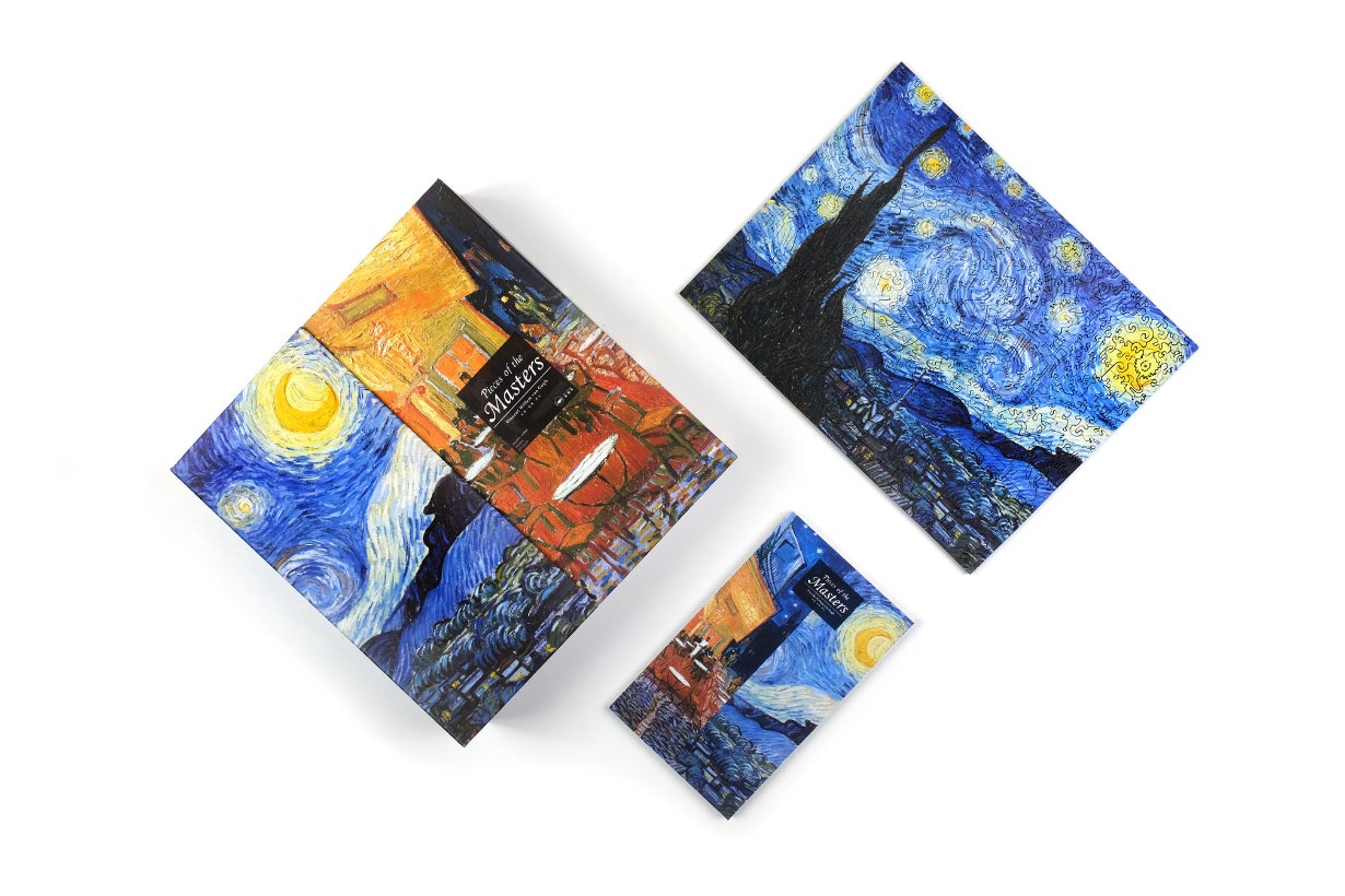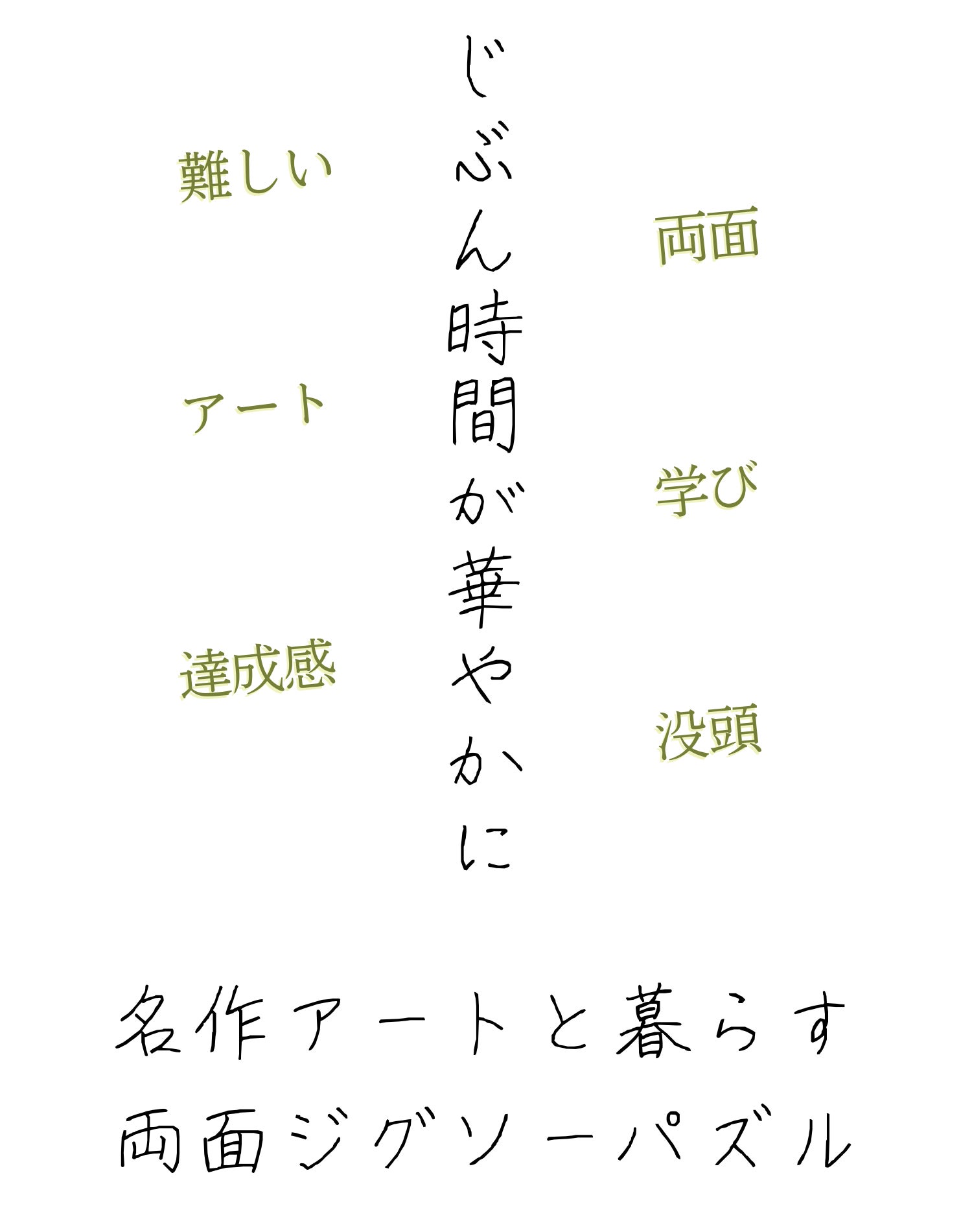 A:巨匠のカケラは両面パズルのため、ピースも両面に印刷が施されています。作品間に難易度の違いは設けていませんが、2作品の色合いが近い作品は難しいことが予想されます。