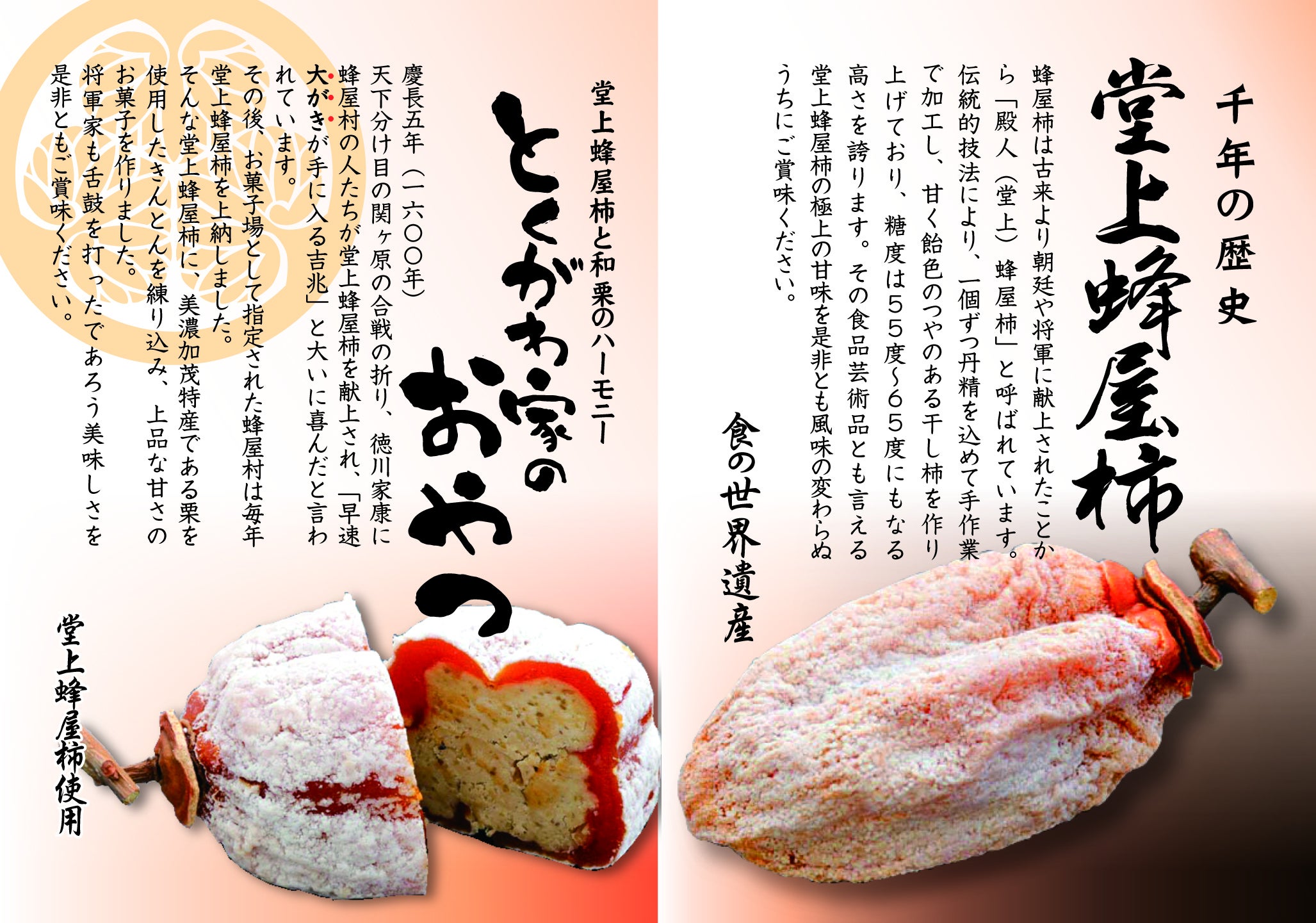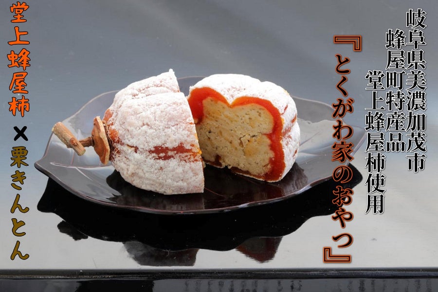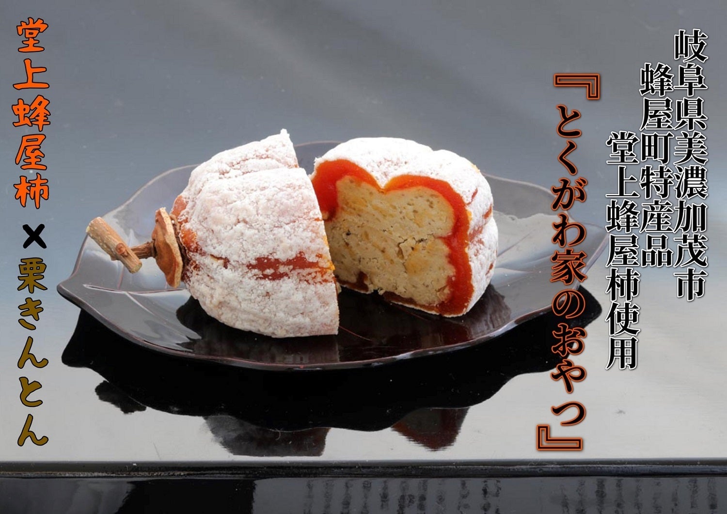 岐阜県美濃加茂市蜂屋町に位置する瑞林寺、通称「柿寺」のお膝元に事業所を構える有限会社川登屋が丹精込めて作る堂上蜂屋柿と地元産の栗を使用した栗きんとん入りの和菓子。