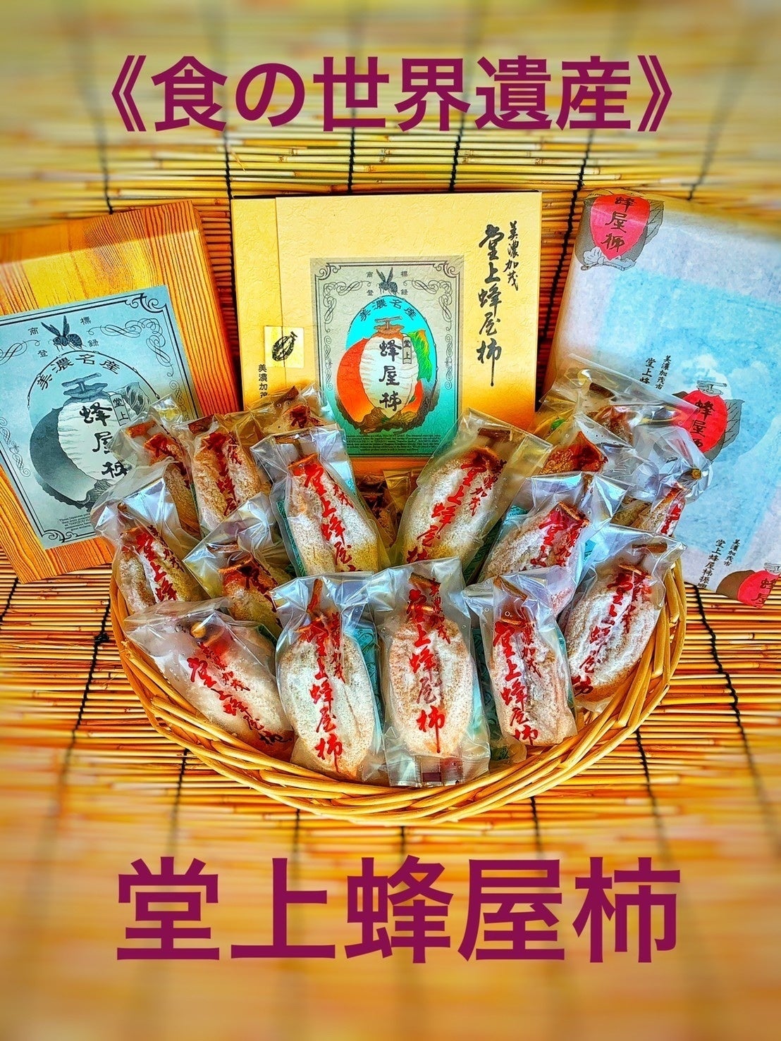 2007年にはイタリアに本部がありますスローフード協会より『食の世界遺産』として『味の箱舟』の認定を受けました。 蜂屋柿なら全て堂上蜂屋柿ではありません、伝統的な技法により、堂上蜂屋という品種の柿を一個ずつ手作業で皮剥きし、風土を活かして干し柿にしたものを「堂上蜂屋柿」と言います。糖度は55度~65度の高さを誇り、ハチミツのように深い甘味としっとりとした食感が特徴です。