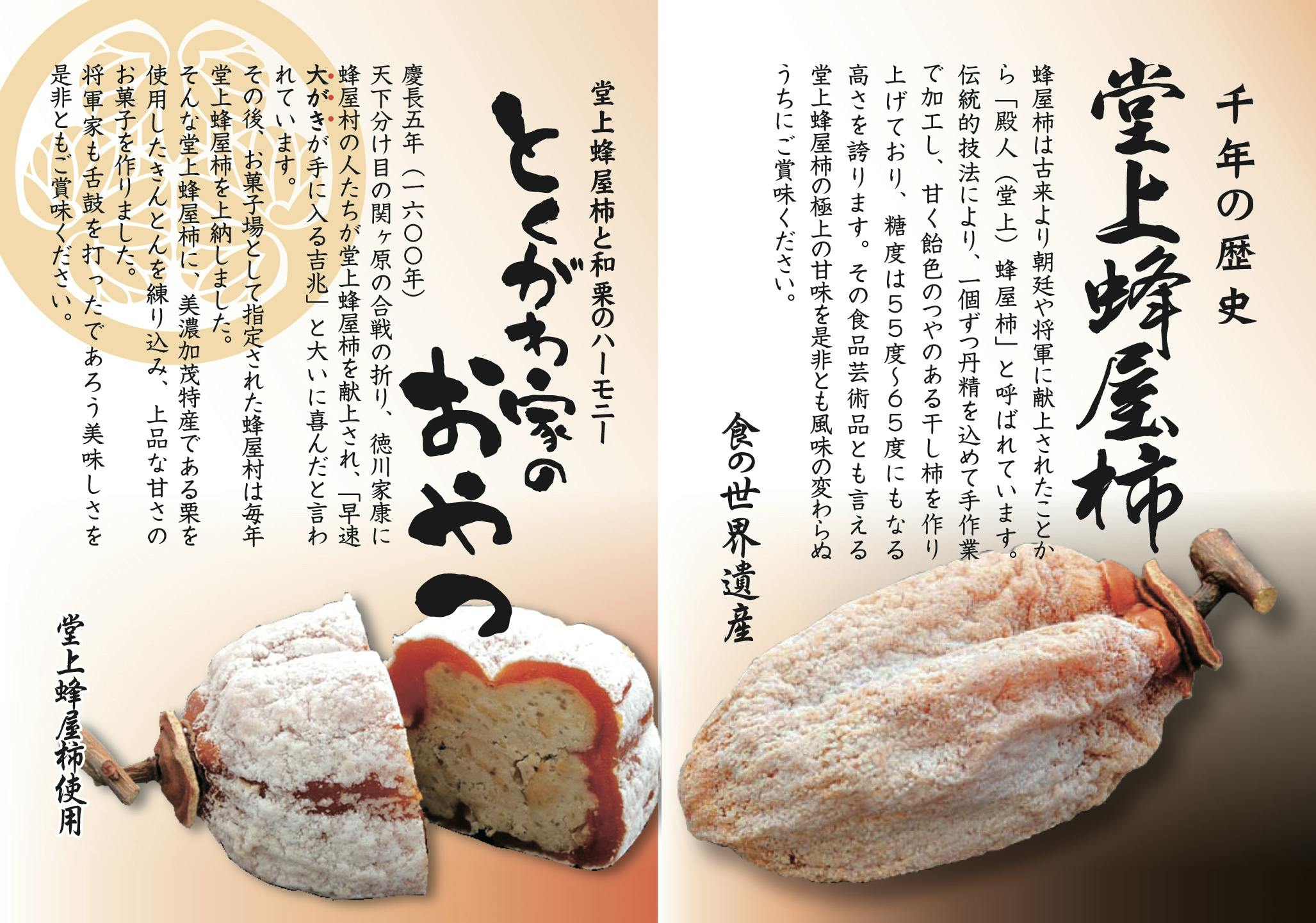 岐阜県美濃加茂市蜂屋町に位置する瑞林寺、通称「柿寺」のお膝元に事業所を構える有限会社川登屋が丹精込めて作る堂上蜂屋柿と地元産の栗を使用した栗きんとん入りの和菓子。
