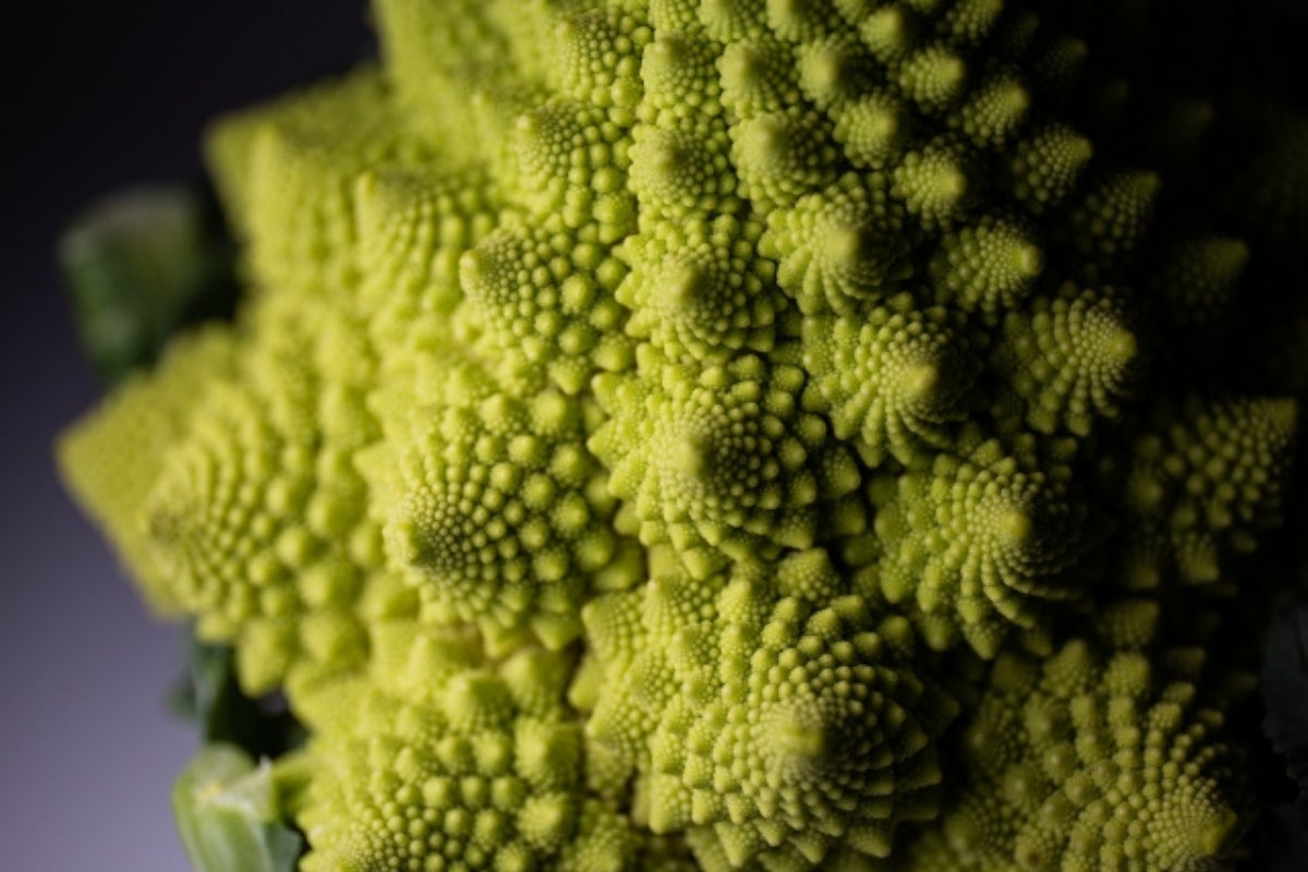 実はこの花蕾、全体でも螺線形を描いていますが、1つ1つの塊を見ても同じように螺線形を描いているんです。これをフラクタル構造といいます。
