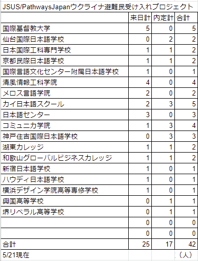 3月に活動を開始してから、400件以上の申し込みを頂いています(JSUS分、パスウェイズ・ジャパン分の合算)。第1陣は、パスウェイズジャパンの参加校(5校)とJSUSの幹事校(9校)を中心に合計25人が来日しました。 また、日本語学校等への入学が内定している学生が17名おり、合計42名の来日に目処が立ちました。高等学校への受け入れも開始し、堺リベラル高校への生徒は5月28日に来日、興国高校への生徒はパスポートが発行され次第来日いたします。