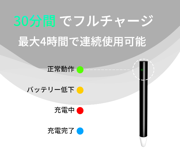 「スマートペン」は280mAh内蔵バッテリーを搭載し、最大4時間使用可能。フル充電はわずか30分で完了します。