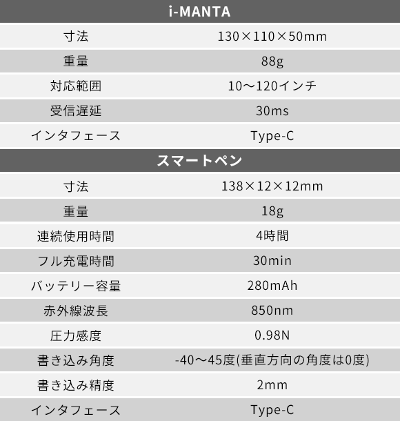 「i-MANTA」に搭載された専用カメラを利用して、「スマートペン」をタッチする際に放出した赤外線を30msの高速で受信できます。受信したデータはパソコンに転送され、高速なデータ処理を実現します。