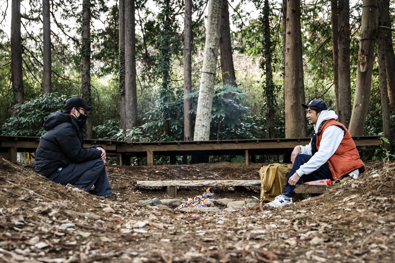 焚き火マイスターの猪野正哉さんに焚き火を作っていただき、
