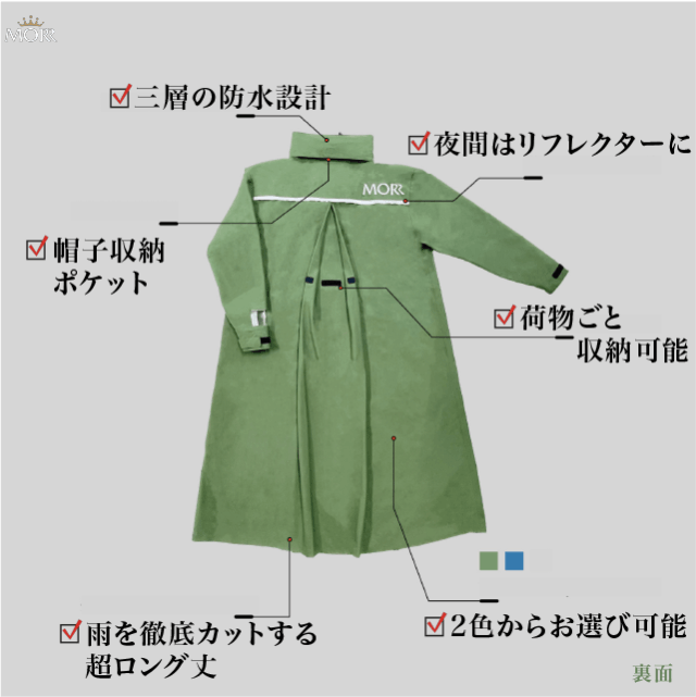 MORRは荷物の収納スペース加味した設計となっているため、リュックをあなたと一緒にすっぽりと覆ってしまいます!