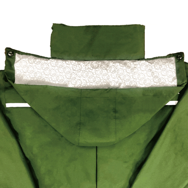 ジッパー部分を斜め開きに設計することで、雨水がレインコートに溜まったとしてもジッパーを貫通しないので、自転車やバイクでの走行時に溜まった雨水がレインコートの中に入ることを防ぎます。