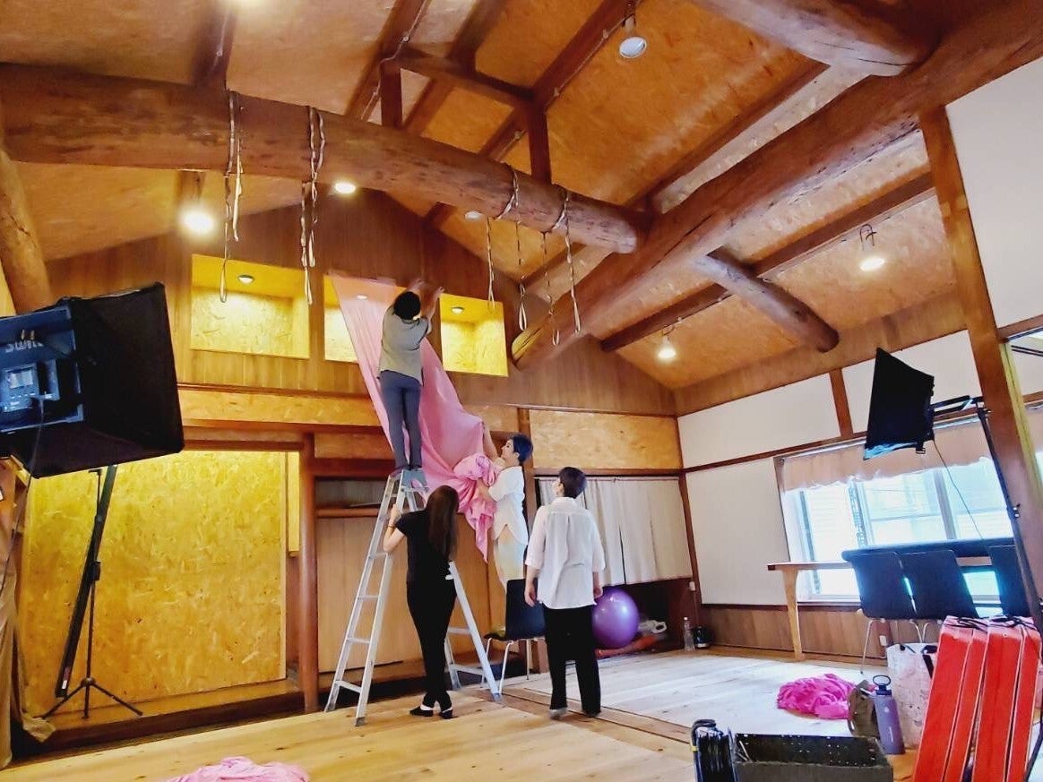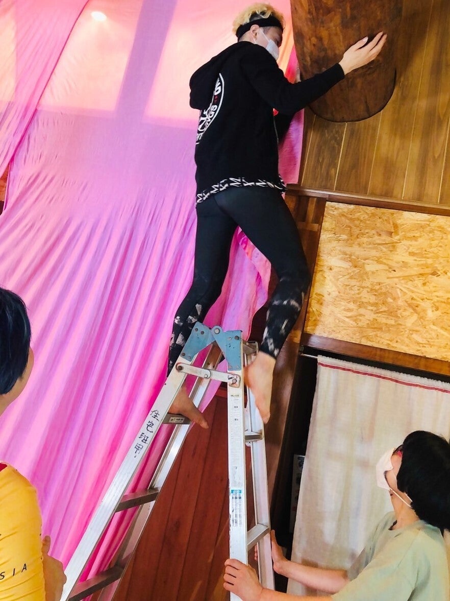 演技をするバックに、一枚布を貼り付けているところです。スタッフや駆けつけてくれたヨガ仲間と協力して会場設営していきました。