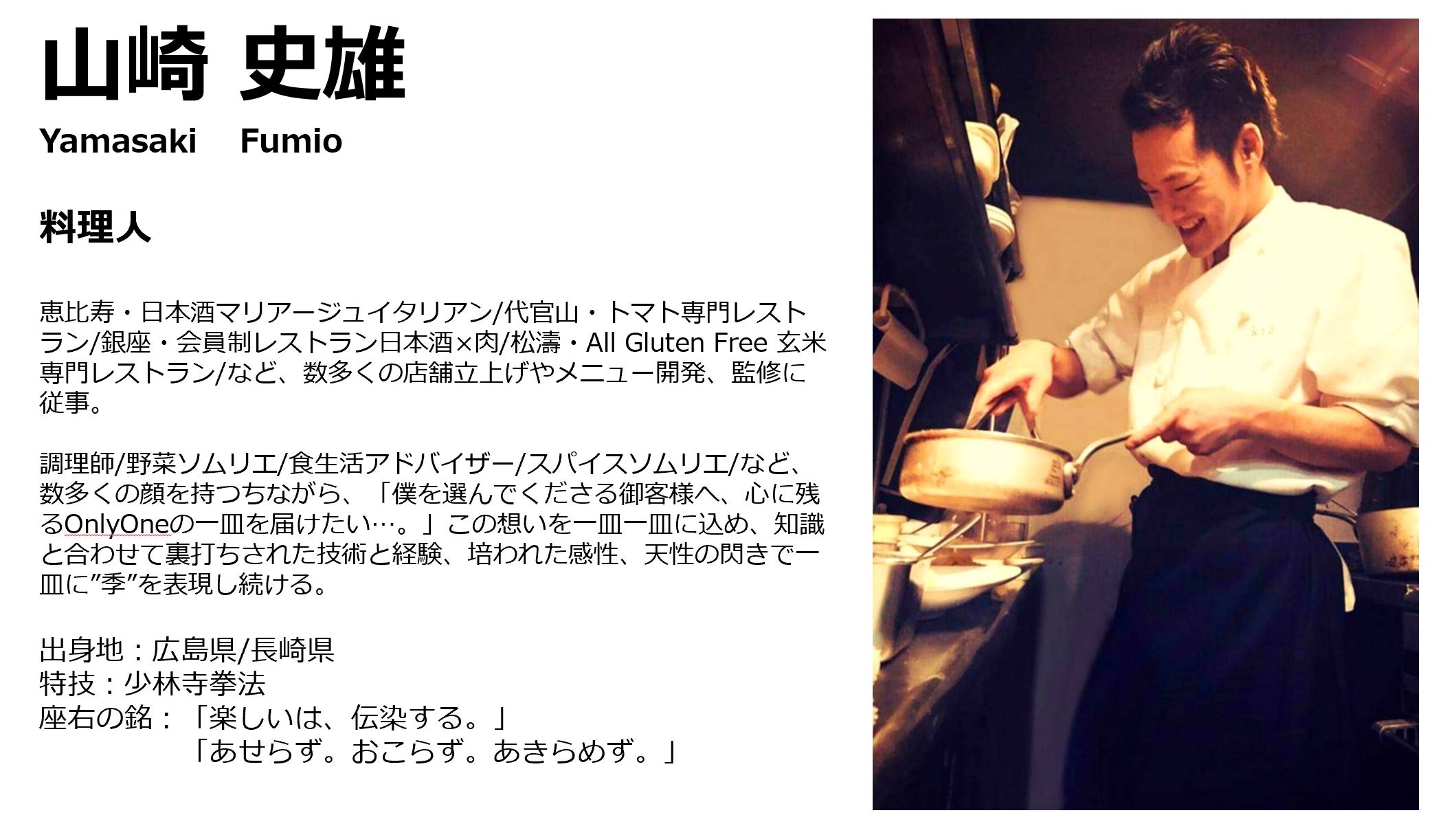 はじめまして、料理人の山崎 史雄です。