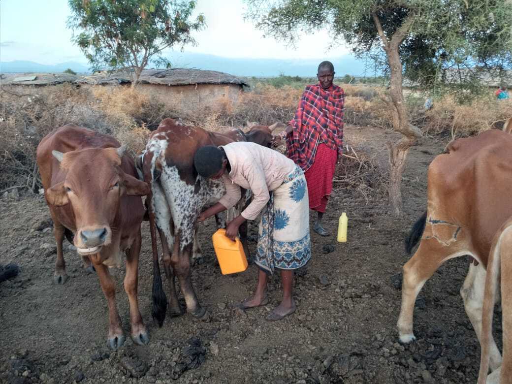 朝6:00、鳥のさえずりや動物たちの鳴き声がする中、お母さんがチャイを入れる為に牛や羊の乳搾りをしています。