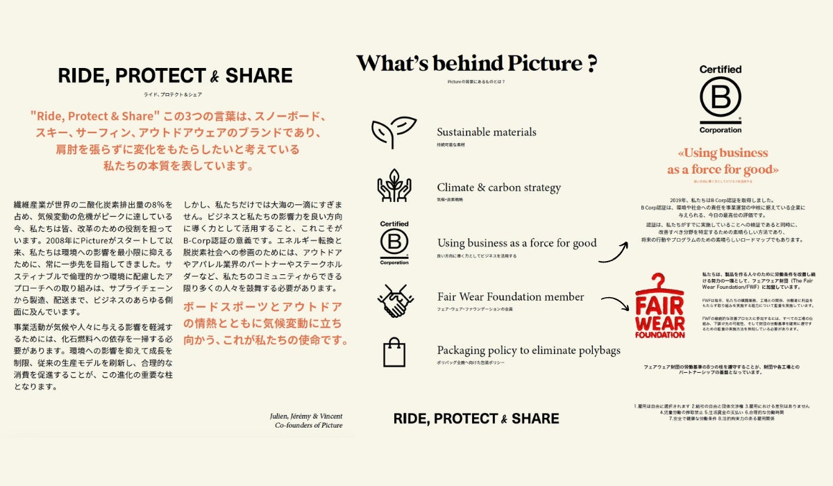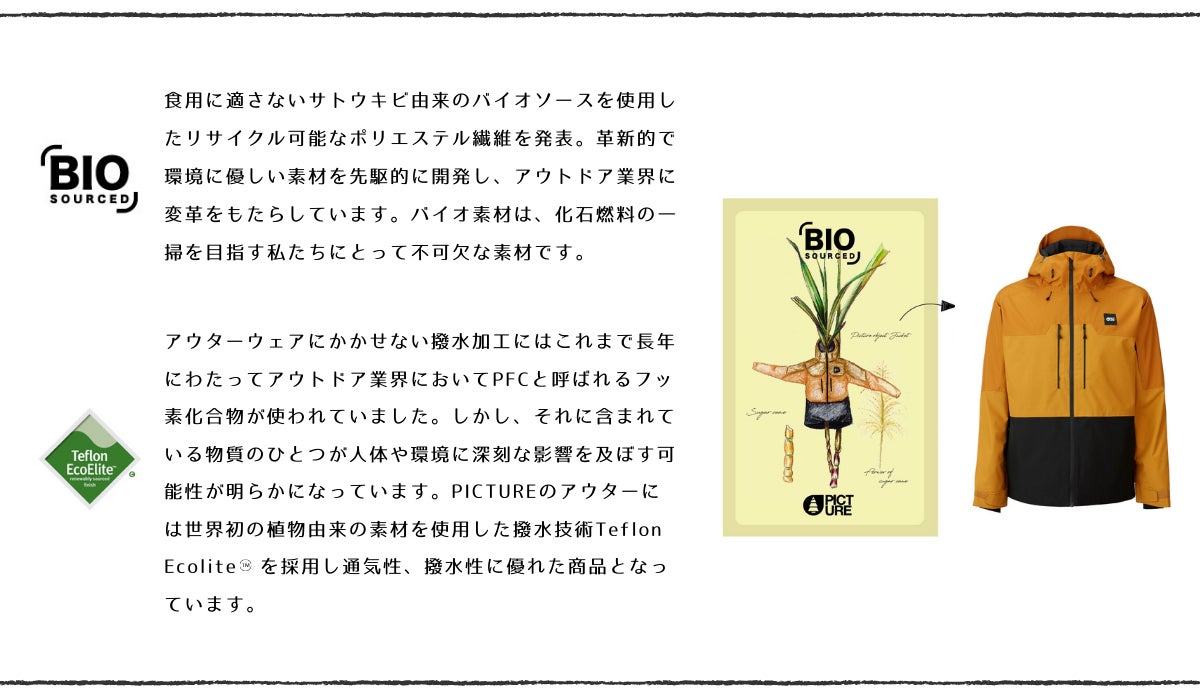 地球温暖化が進む中、私たちはスキー、スノーボード、サーフィンなどのフィールドである海や山の豊かさを守るべく気候変動に立ち向かう取り組みを行っています。その一環としてSDGsの目標達成と持続可能なより良い社会の実現に向けて貢献できるよう環境に配慮した製品の取り扱いおよび活動を行っています。そんな中で私たちが出会ったのはPICTURE ORGANIC CLOTHING(以下PICTURE)です。