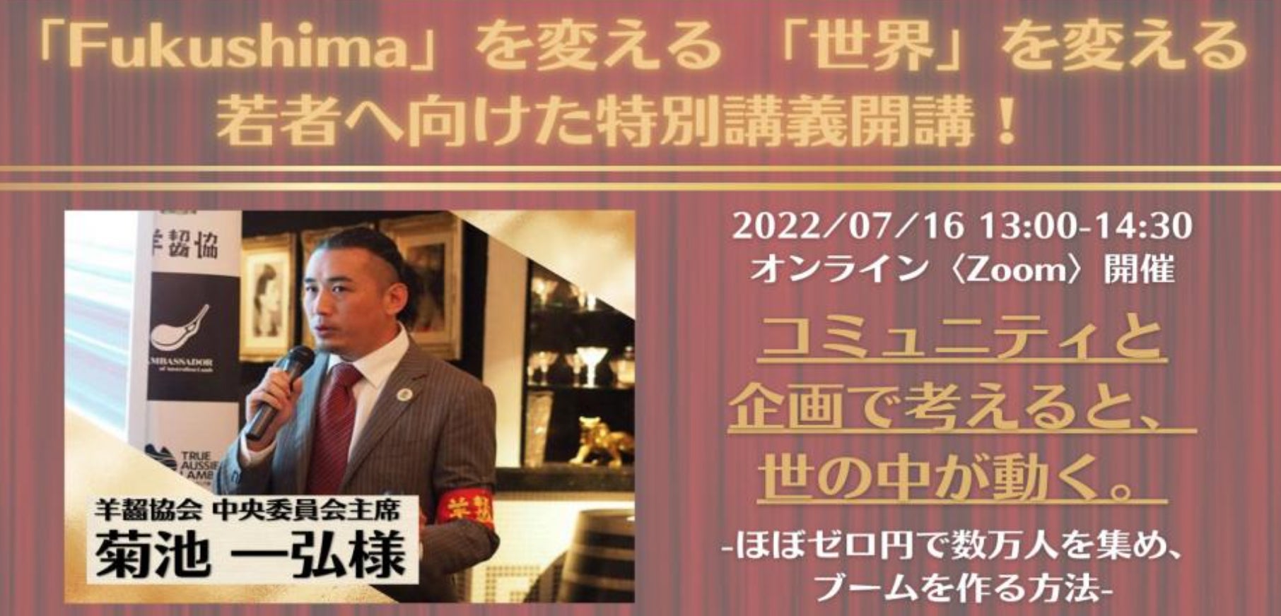 2022/07/12 12:00コミュニティと企画で考えると、世の中が動く。〜ほぼゼロ円で数万人を集め、ブームを作る方法〜ーこんな方に見て欲しい!!「イベントを企画してみたい方!」「集客するのが苦手な方」「何か大きなことを成し遂げてみたいけど、何から始めたらよいかわからない...」「コミュニティを作るのに興味がある方」…上記に1つでも当てはまる方は、ぜひこの講演をご覧頂くことをおすすめします。講演を通して、答え・ヒントが見つかるはずです。【講師】菊池一弘氏(羊齧協会 中央委員会主席)【講義タイトル】コミュニティと企画で考えると、世の中が動く。-ほぼゼロ円で数万人を集め、ブームを作る方法-【内容】(講義:13:00~14:00 質疑応答:14:00~14:30)世の中、人を集められる技術があれば何でも応用可能。その基本となるのがコミュニティベースで考える大切さです。この技術があれば、企業、自治体、国、大使館などと全く別の切り口での仕事も可能ですし、個人のイベントから10万人規模のフェスティバルまで広告代理店、PR会社、イベント会社抜きでも運営できます。その基本にあるのは、コミュニティ、世界観、物語、企画です。この仕組みがかっちりはまれば、予算なしでも世の中を動かすことが可能です。今回は、そのさわりの部分を実体験を元にお話しさせていただきます。【講師の方からのメッセージ】色々な技術の中で、一番私が役に立っているのがこの人を集められる!能力です。今回は、ここ15年で得た知見をギュッと濃縮。どういう考えで、何をやってきたのかをまとめてお伝えします。50人集まっても何も起こりませんが、数万人集まれば世の中が動きます。【プロフィール】岩手県出身。北京外国語大学卒。株式会社場創総合研究所 代表取締役一社 来来県 代表理事一社 日本中国白酒協会 理事羊齧協会 中央委員会 主席麻辣連盟 幹事長得意は三密作り。エッジを立てコミュニティを作りその集まった人たちの力を利用し、新しい動きを作る事が得意。2019年はPR費99,000円で、14万人を動員。消費者主導、好意的第三者など独自の視点で、人と人をつなぎ、ブームを作る仕掛け人。その他にも、エッジを立てて企業を集める「麻辣グランプリ」「ジンギスカングランプリ」の企画とプロヂューサーを務める。取引先は、大使館、海外の公的機関、自治体等から、企業、公益団体、そして、個人まで、基本なんでも。メディアの設計、ライティング、新規企画のネタ出し、飲食店のアドバイザー、メディアのリブランディング、メーカーのSNS担当など、基本的に何でもできます。お申し込みは、下記のPeatixのイベントページから!!https://peatix.com/event/3206761/view もっと見る