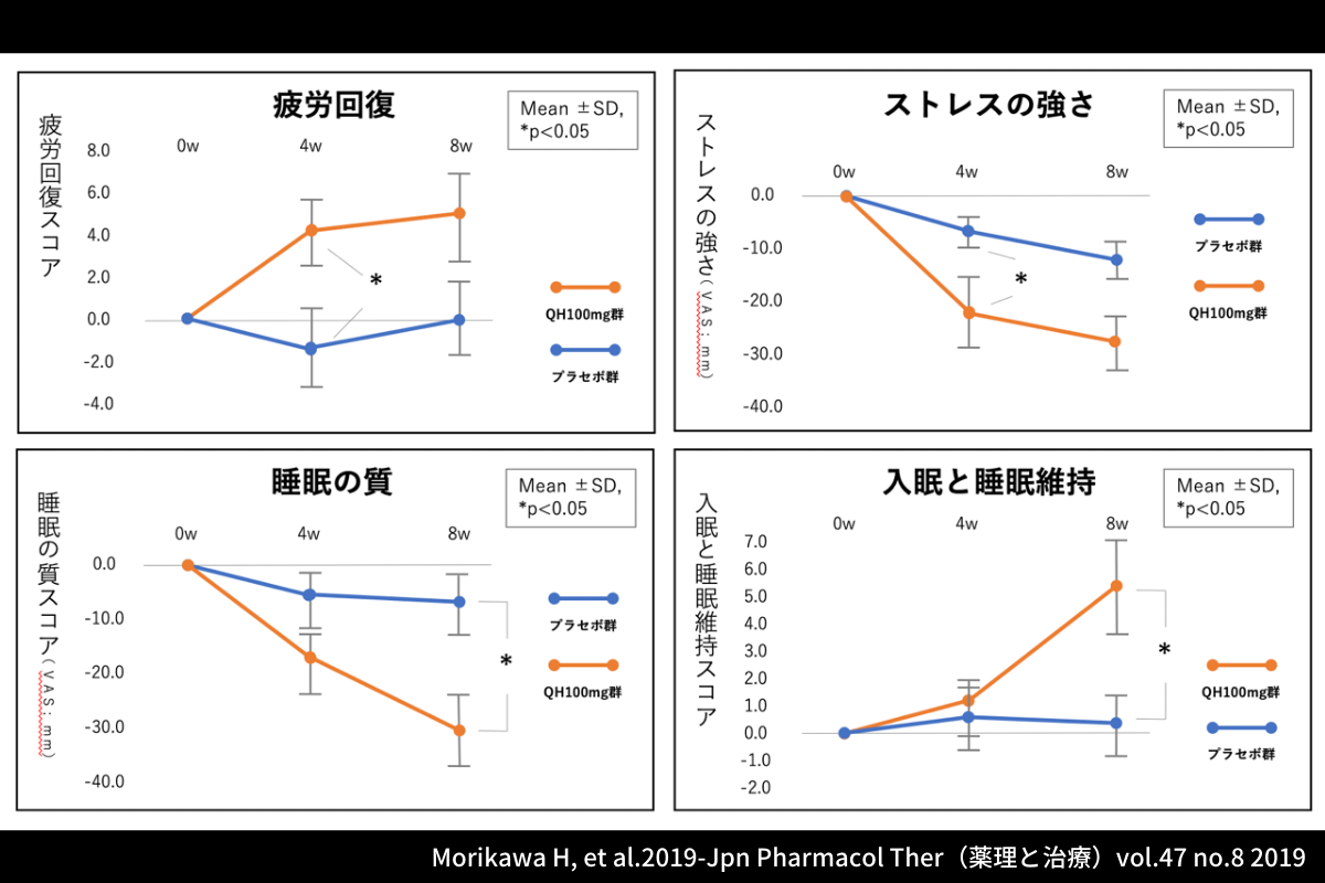 還元型コエンザイムQ10が健康維持に有用だということは、いろいろな研究からも知られるようになっています。オレンジのグラフが還元型コエンザイムQ10を使用した方の体感値です。