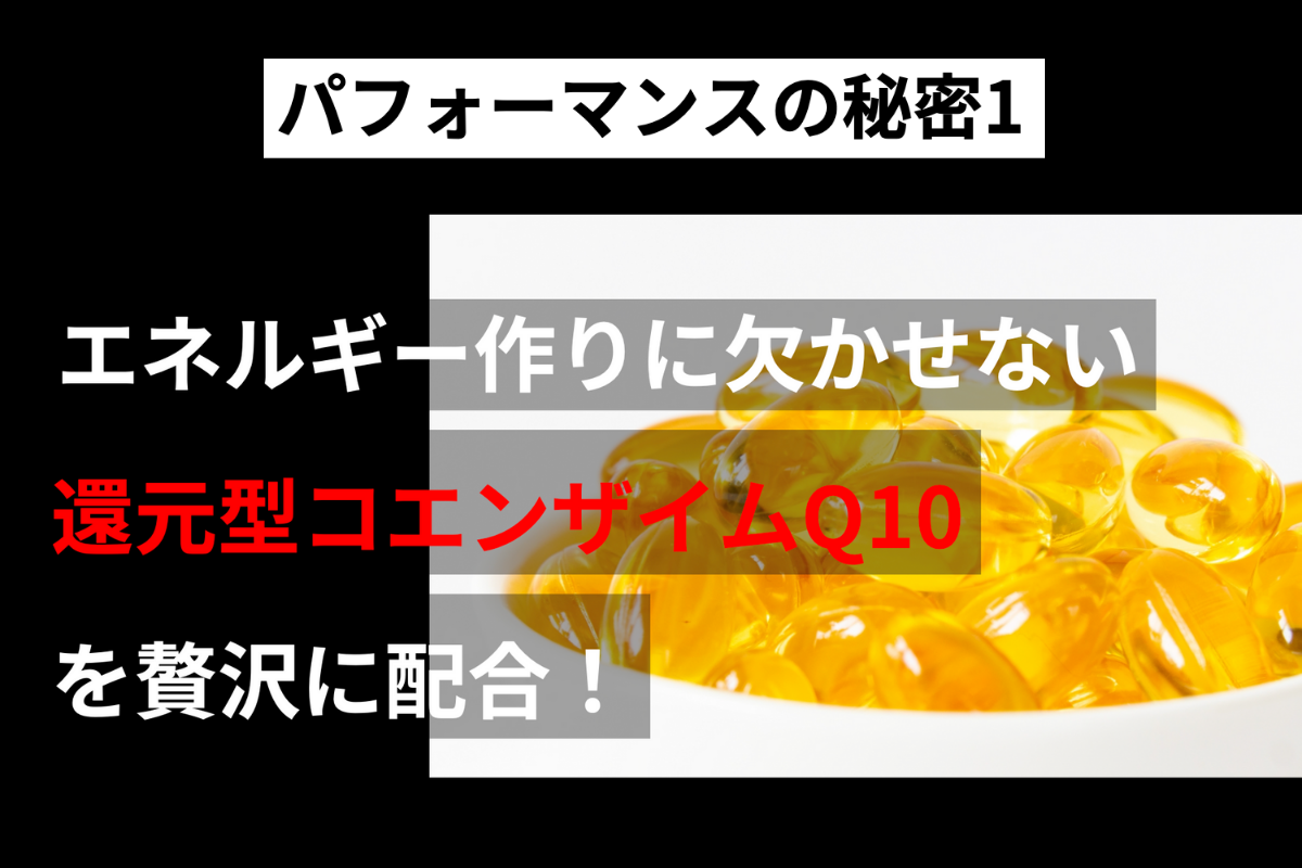 ゲーマーのパフォーマンスに効果的な成分を網羅的に配合し、還元型コエンザイムQ10によるエネルギー生成作用によって、ガチゲーマーを全力で応援します!