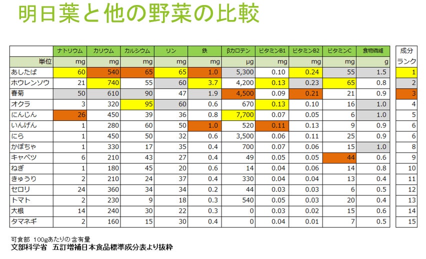 といえば「にんじん」・・・といった具合に、成分1位の野菜はご存じだと思います。明日葉は、