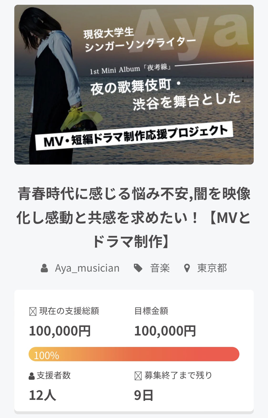 こんにちは!Ayaです☆彡残り14日(二週間)となってしまいましたが、新しいリターン品3つと、少し告知も兼ねたご報告がありますので活動報告させていただいております!①劇中歌「ALLERGY」デモカード リターン品追加夜考線プロジェクト・ショートドラマに使用される劇中歌がデモが完成しましたのでお知らせいたします♬その名も「ALLERGY」!!!爽やかな歴代のジャケ画像とは違い毒々しい赤色をベースにしたジャケ画像にいたしました!曲の中身も同様普段のAya作詞作曲とは一味違う楽曲となっていますので、ぜひ気になった方はご購入くださいませ!以下のリターン品ご支援いただいた方には、QRコードを裏面につけたQRカードを郵送させていただきます!②タトゥーシール リターン品追加MusicVideoの為に制作しているオリジナルタトゥーシールを購入者様に郵送させていただきます!Ayaが映像内で身につけるものと全く同じ!ぜひライブで一緒に身につけましょう☆彡話変わりまして、クラウドファンディング開始頃に企画をしました!こちら!高校2年生「大貴」役を学生の中から募集を募り、現場経験の一つとして実践してほしいという企画をさせていただきました!ありがたいことに応募いただき、決定いたしましたので、近々ご報告させていただきます♬次の活動報告をお楽しみに!!!そして、残り14日...!大大大ピンチですので!拡散だけでもうれしいです☆彡ご支援・ご協力していただけるととても助かります!200%を狙っています!よろしくお願いします♬