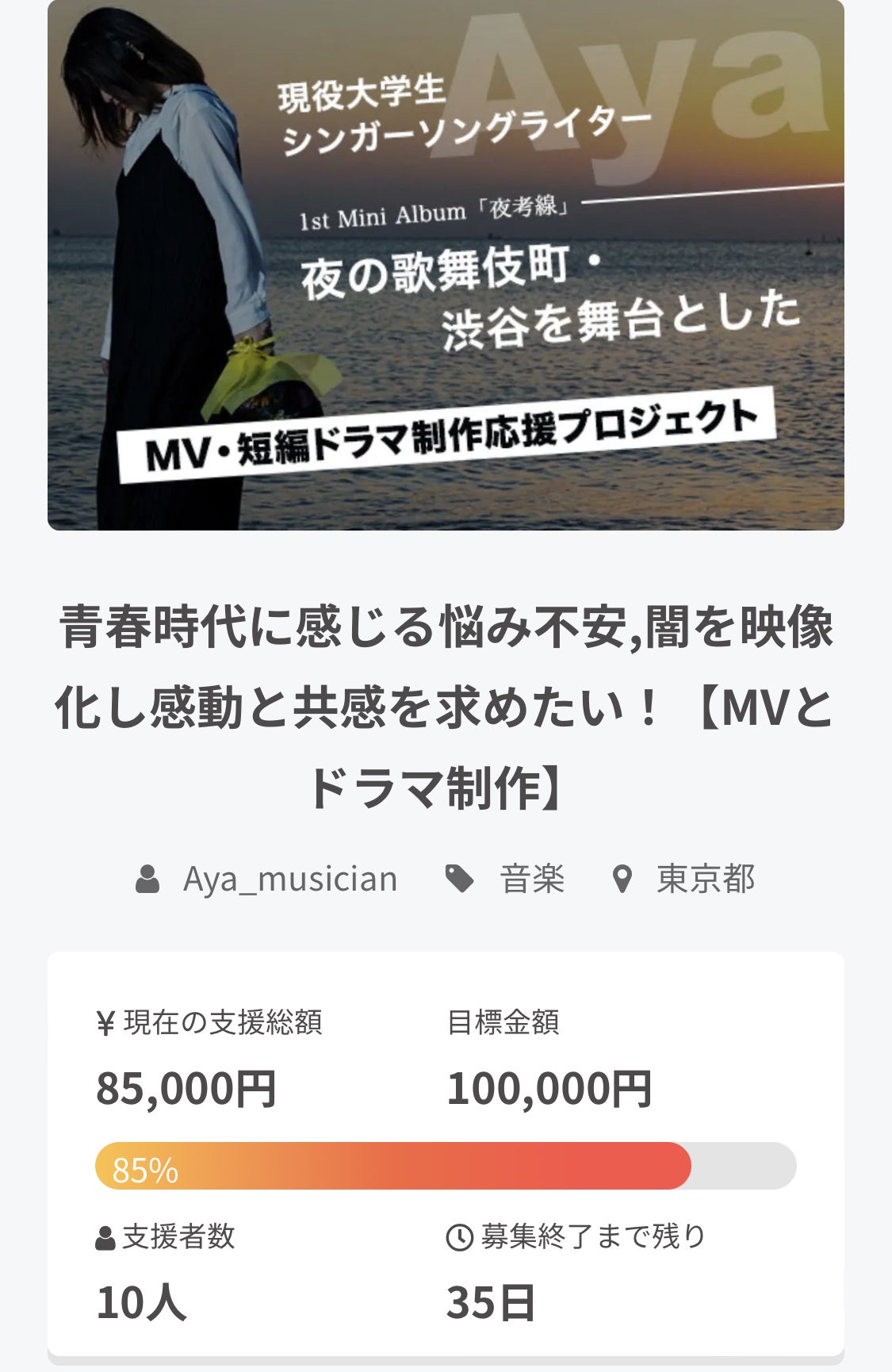 おはようございます!本日で残り7日となりました!あと1週間です!早いものですね……!でもここから150%.200%目指していきたいと思っていますので、ラストスパート協力いただける方は、ぜひご支援ご協力・拡散お願いいたします♪また、夜考線プロジェクトはここからが本番です…!6月に本レコ、8月に役者・撮影スタッフ交えての決起会を行う予定で、9月に撮影本番、11月~12月で動画を公開!アルバムも発売……!ここから半年続く長丁場プロジェクトとなります……!今後もSNS上で応援していただけるととても嬉しいです♬︎よろしくお願いします!Aya