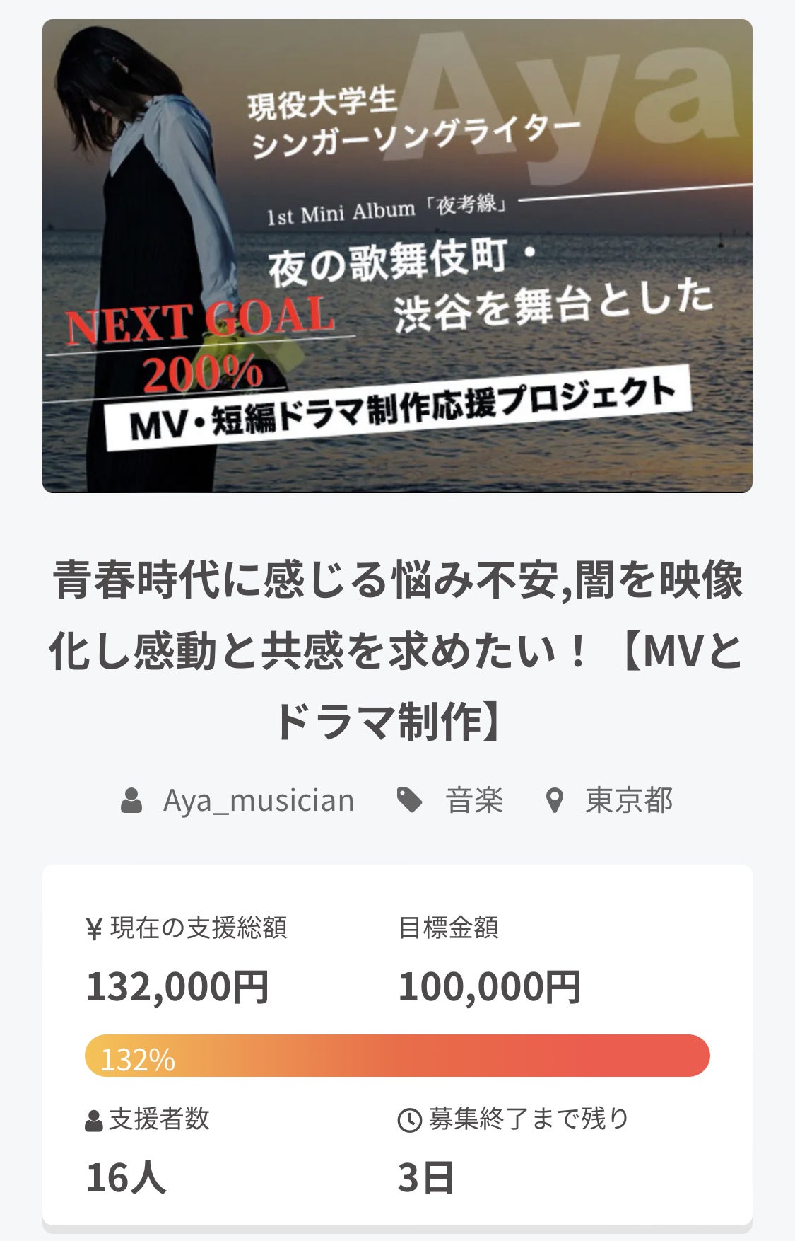 ありがたいことに残り2日を切る事ができました!一昨日の夜からラストスパートをかけてくださっていて、100,000円 → 132,000円になりました!とっても嬉しいです!ありがとうございます✩.*˚この調子で残り2日で200%(200,000円)を目指していきますので、ご支援ご協力よろしくお願いします♬︎
