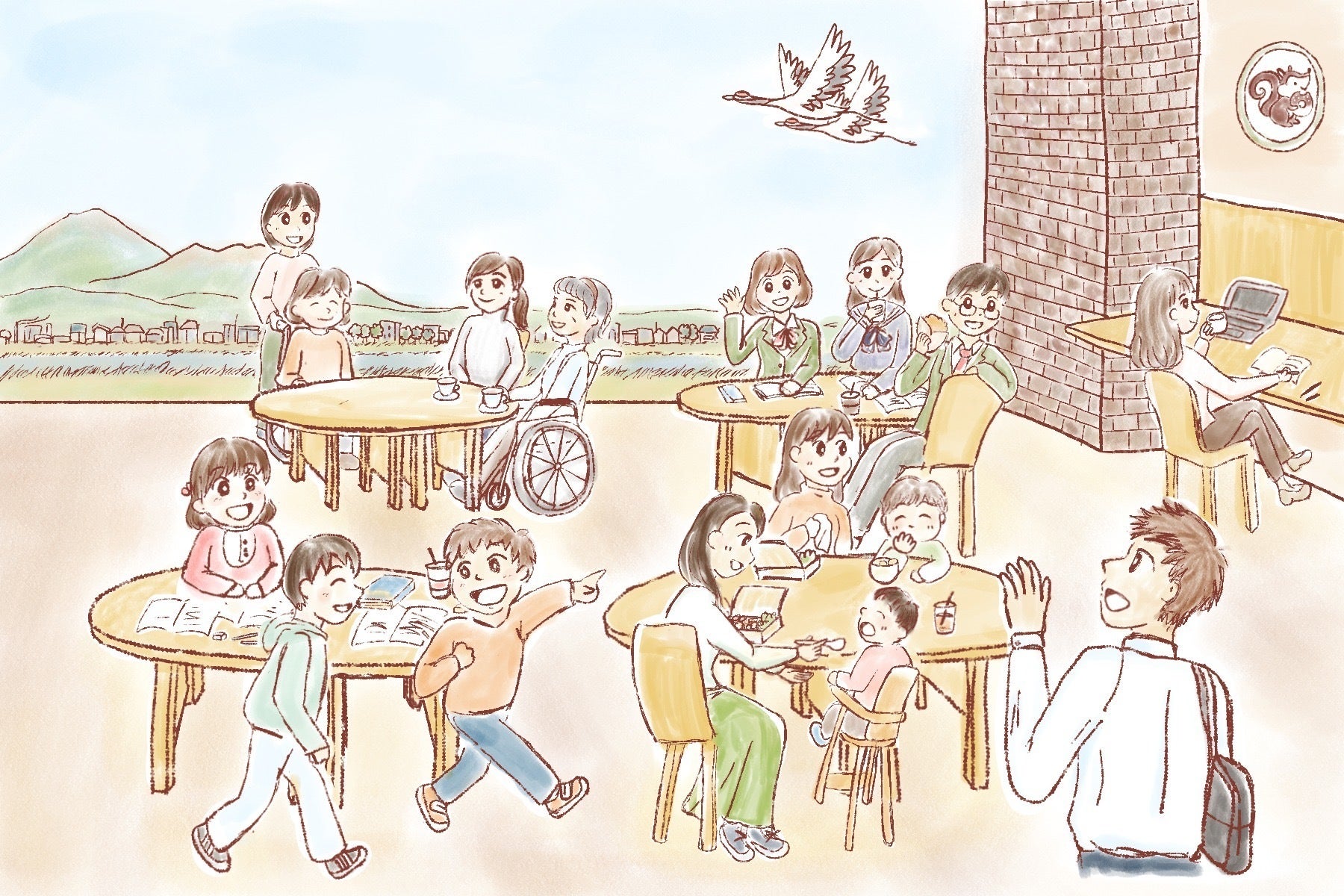 車いすやベビーカーでも使いやすいテーブル・椅子を用意する予定です。また導線も段差などがなるべくなく、空間にもゆとりをもった導線を確保します。