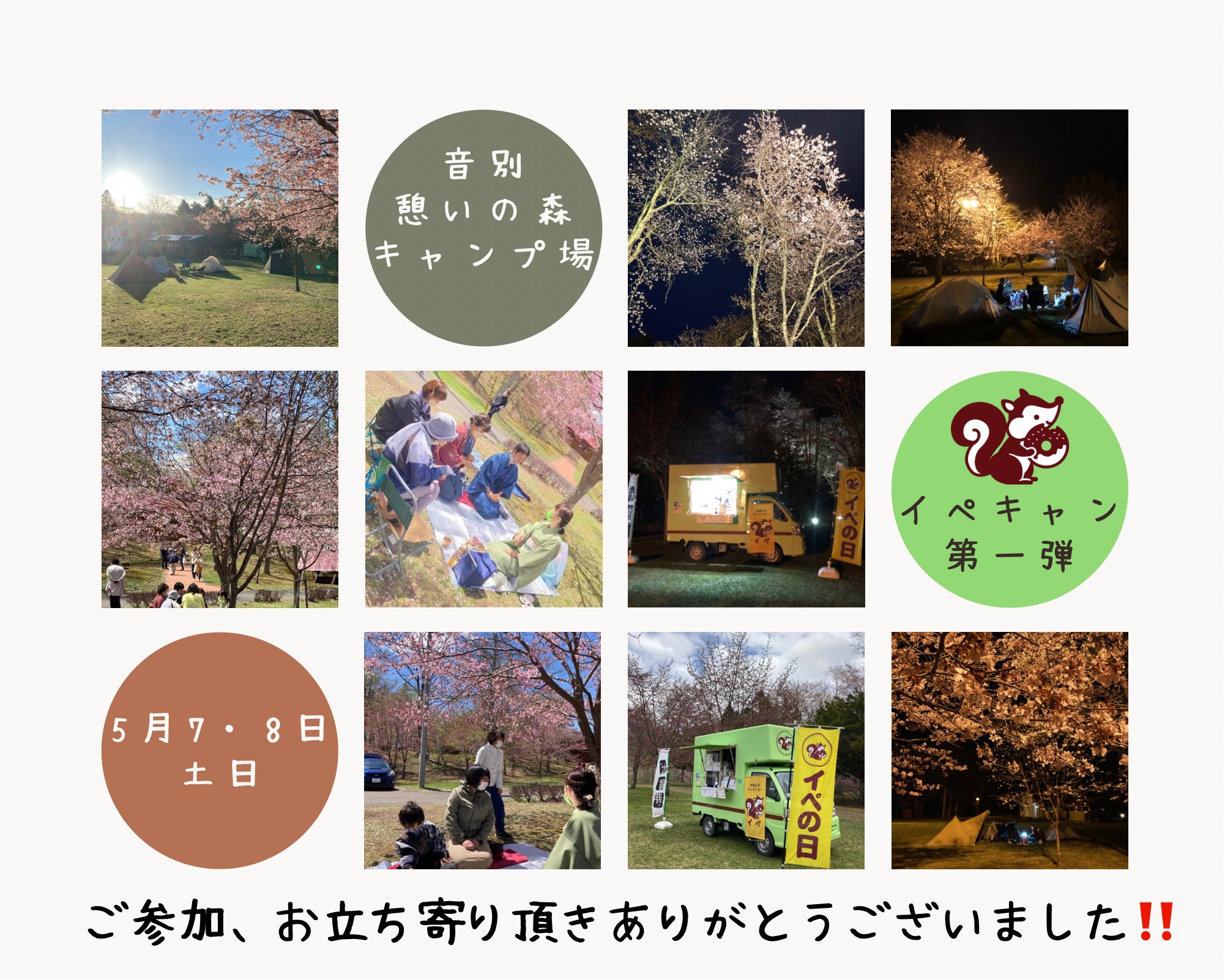 7.8日の土日に音別憩いの森キャンプ場にて『イペキャン』開催しました!当日まで天気が心配でしたが、おかげさまでイベントには影響なく、無事行うことができました!お花見に来られている方々にイペを知ってもらういいきっかけにもなりましたしお花見お抹茶体験会では、海外の方々にも楽しんでもらったり、お子さんたちや着物で参加して下さった方々も!イベントの日はちょうど母の日!ということでカーネーションのバルーンを作って持って来て下さった方のおかげで、体験会を盛り上げて頂き、参加した方にプレゼントさせて頂くこともできました。たくさんの方にご協力、そしてお立ち寄り頂き感謝申し上げます。イペはこれからもキャンプイベント着物&お抹茶イベントお子様大歓迎の体験型イベント健康増進イベント他の方とのコラボイベントなど、釧路でのワクワクするようなイベントを増やしていきたいと思っています!今後もイペのイベントに注目してくださると嬉しいです。よろしくお願い致します!