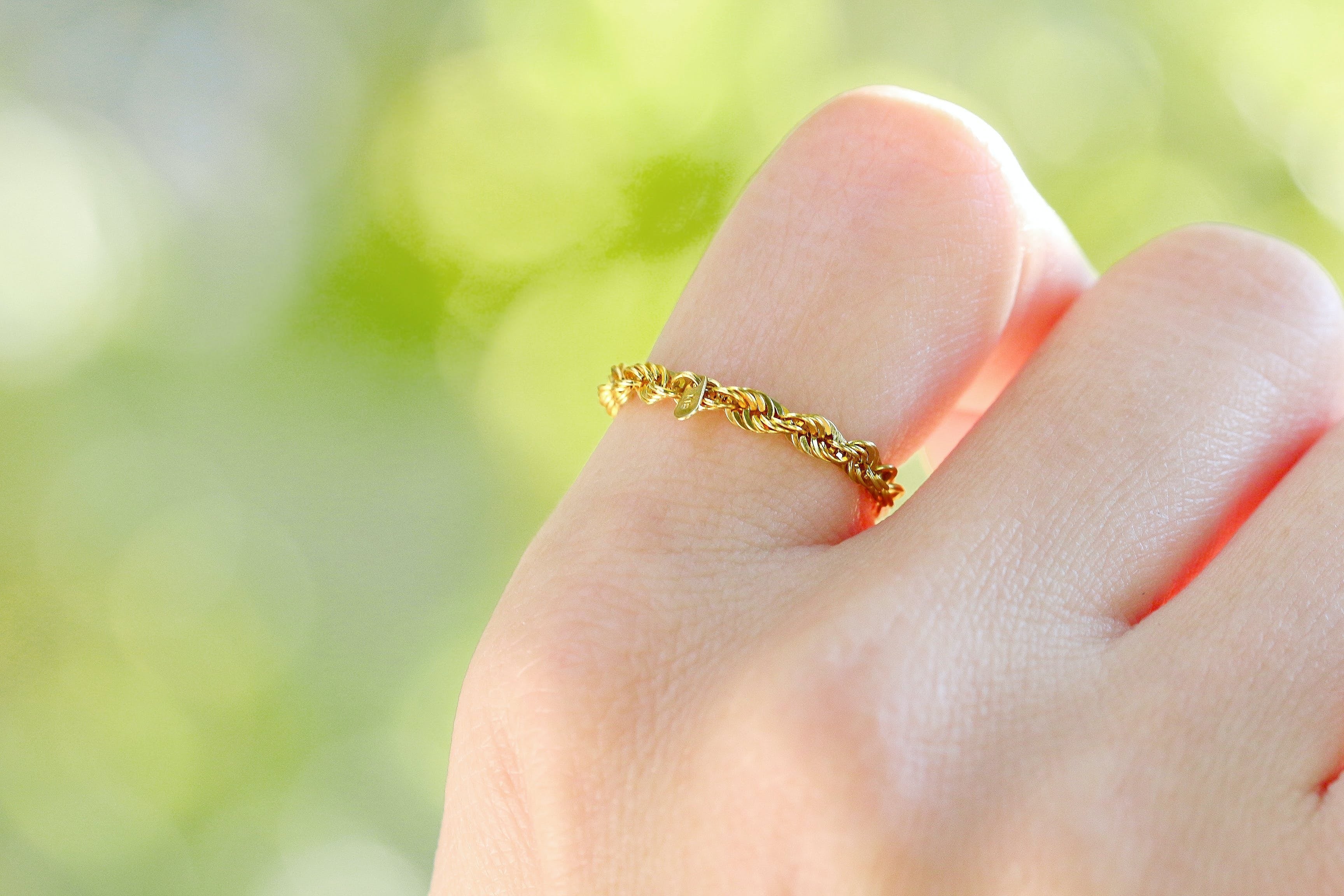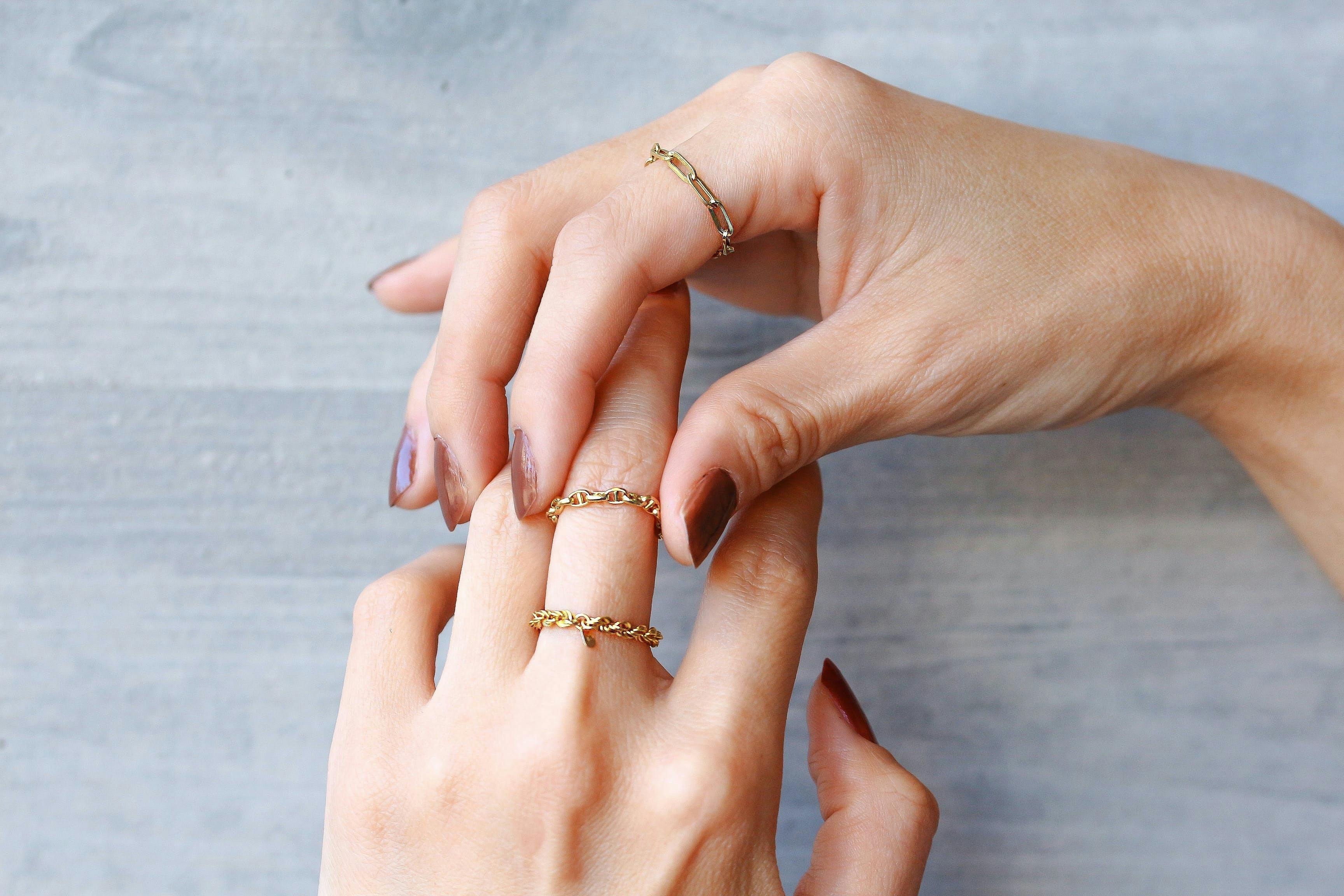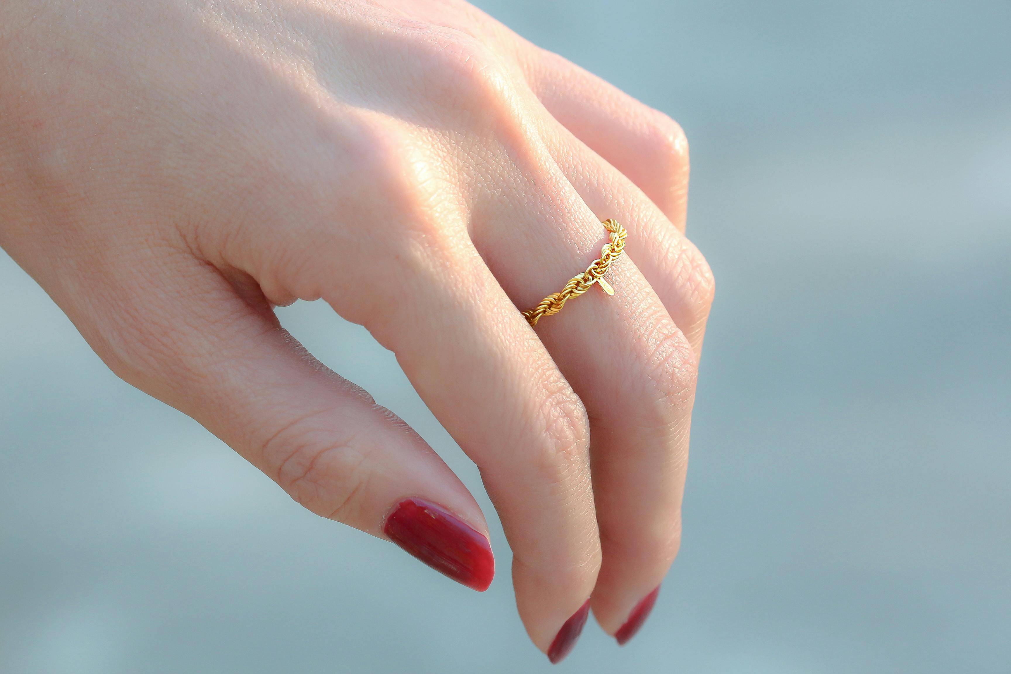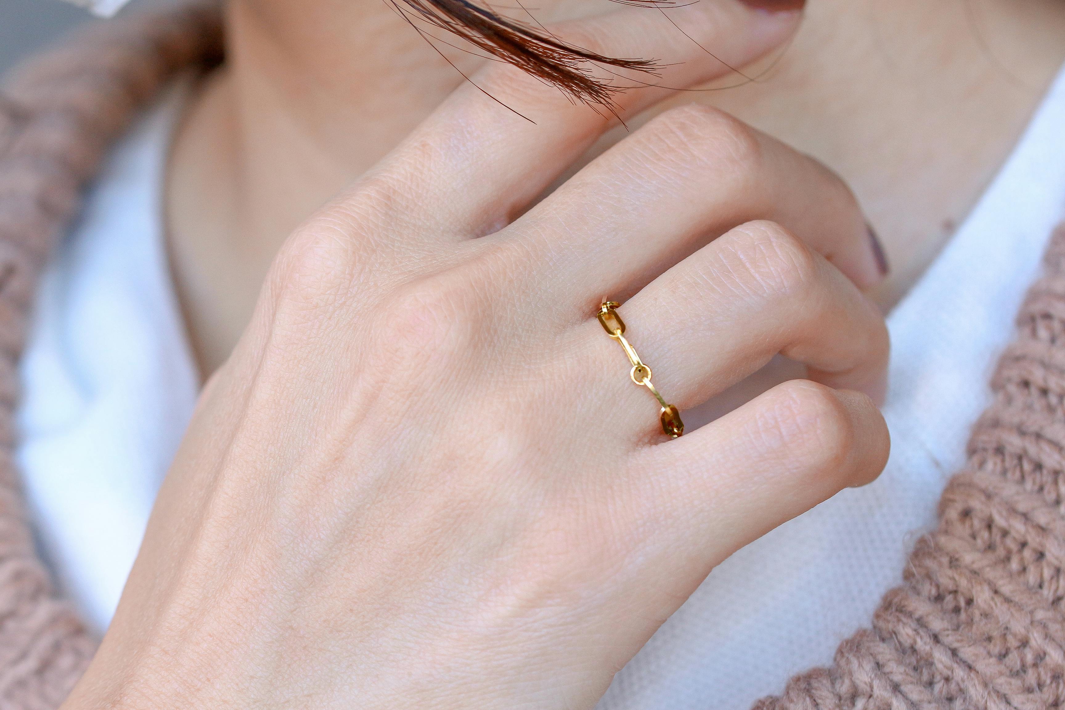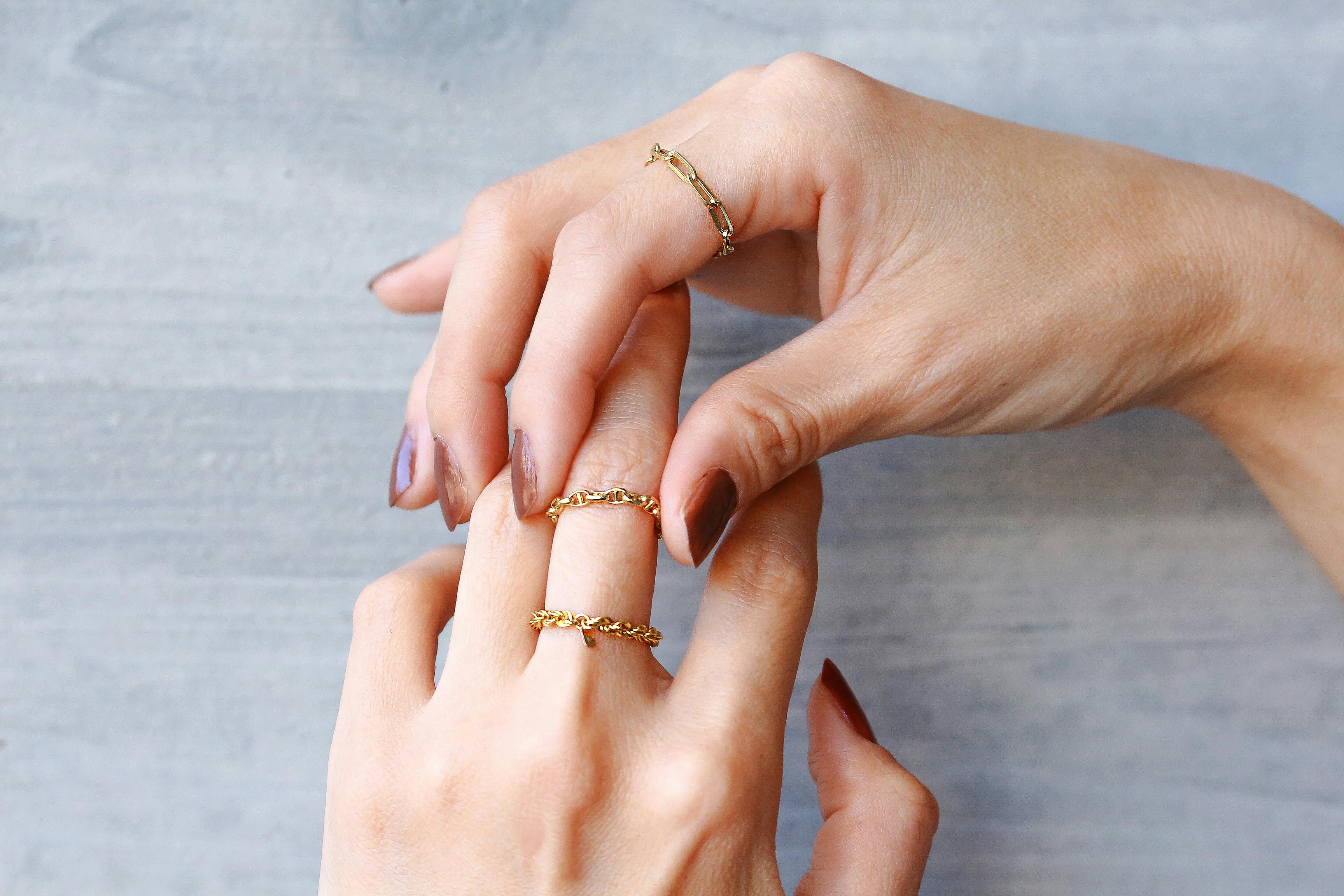 存在感がありながら自己主張しないチェーンリングは、リングの重ね付けやブレスレットとの組み合わせなど、他のファッションアイテムを引き立てます。