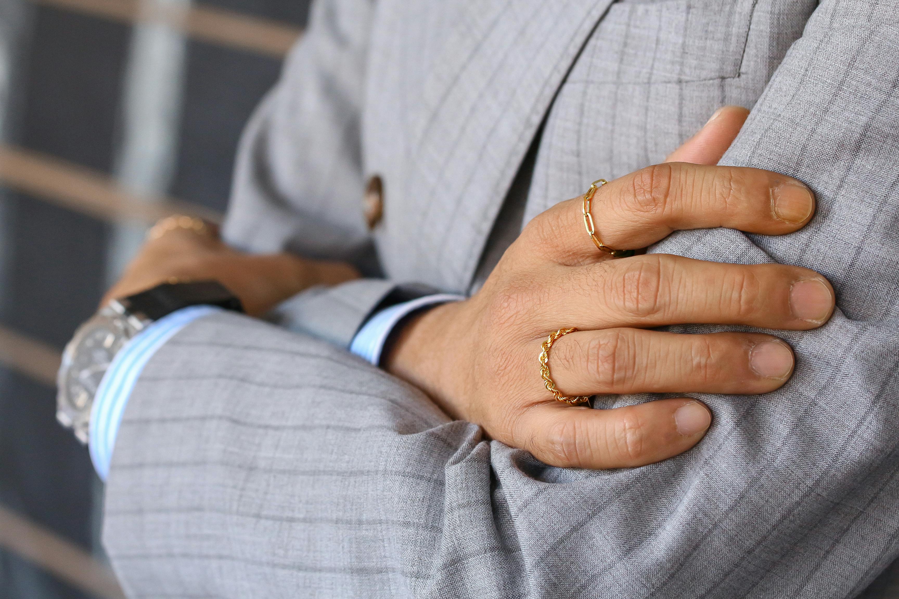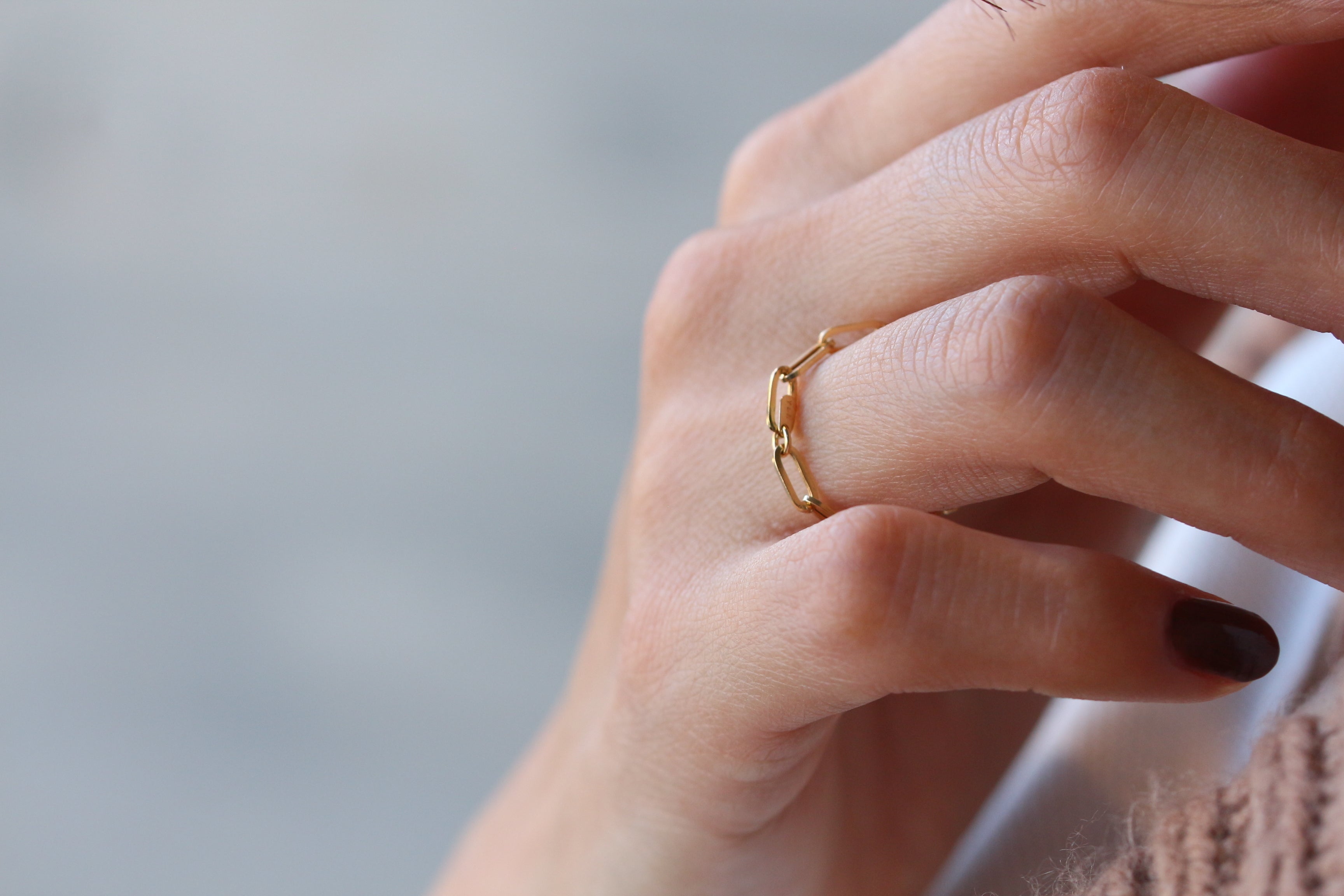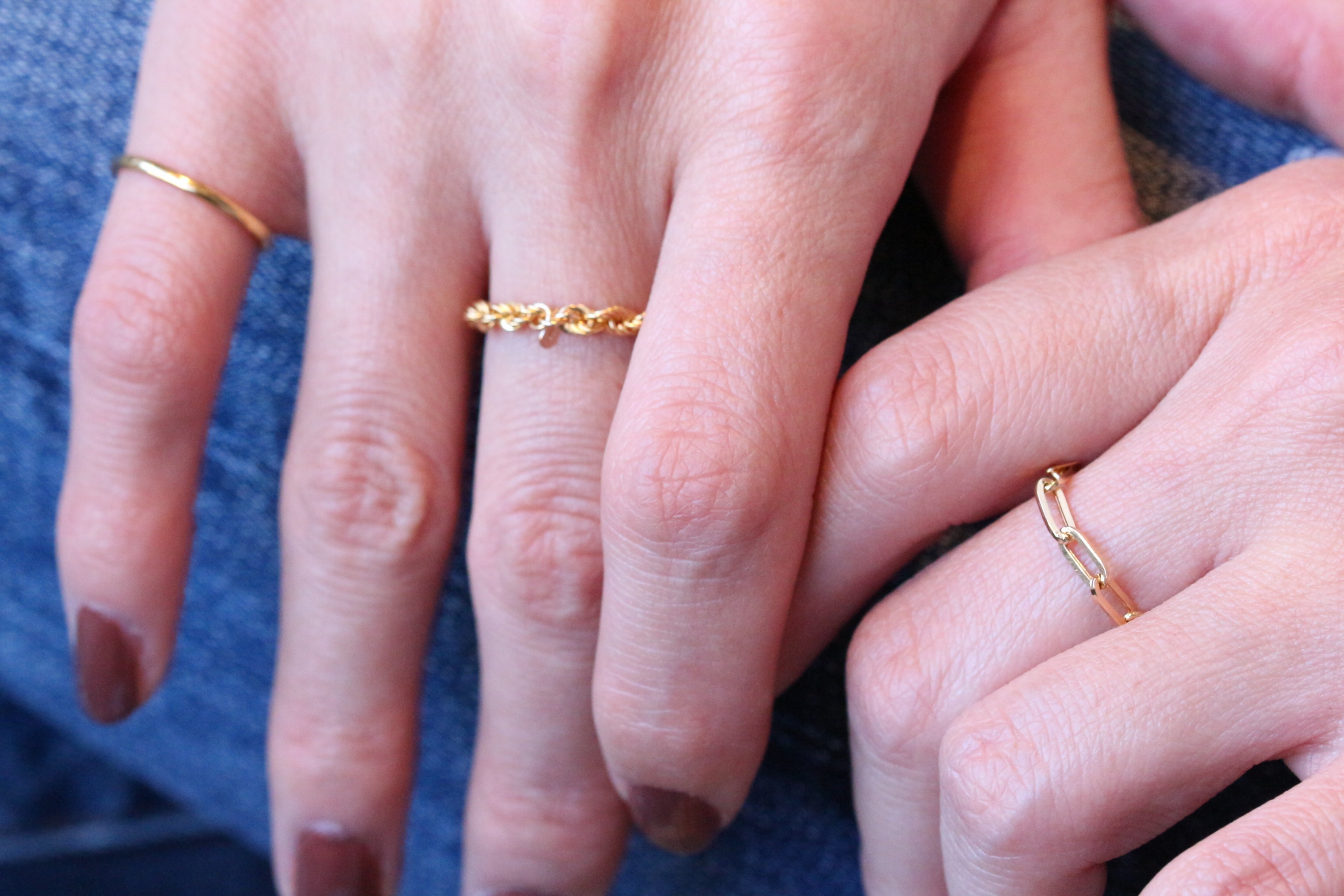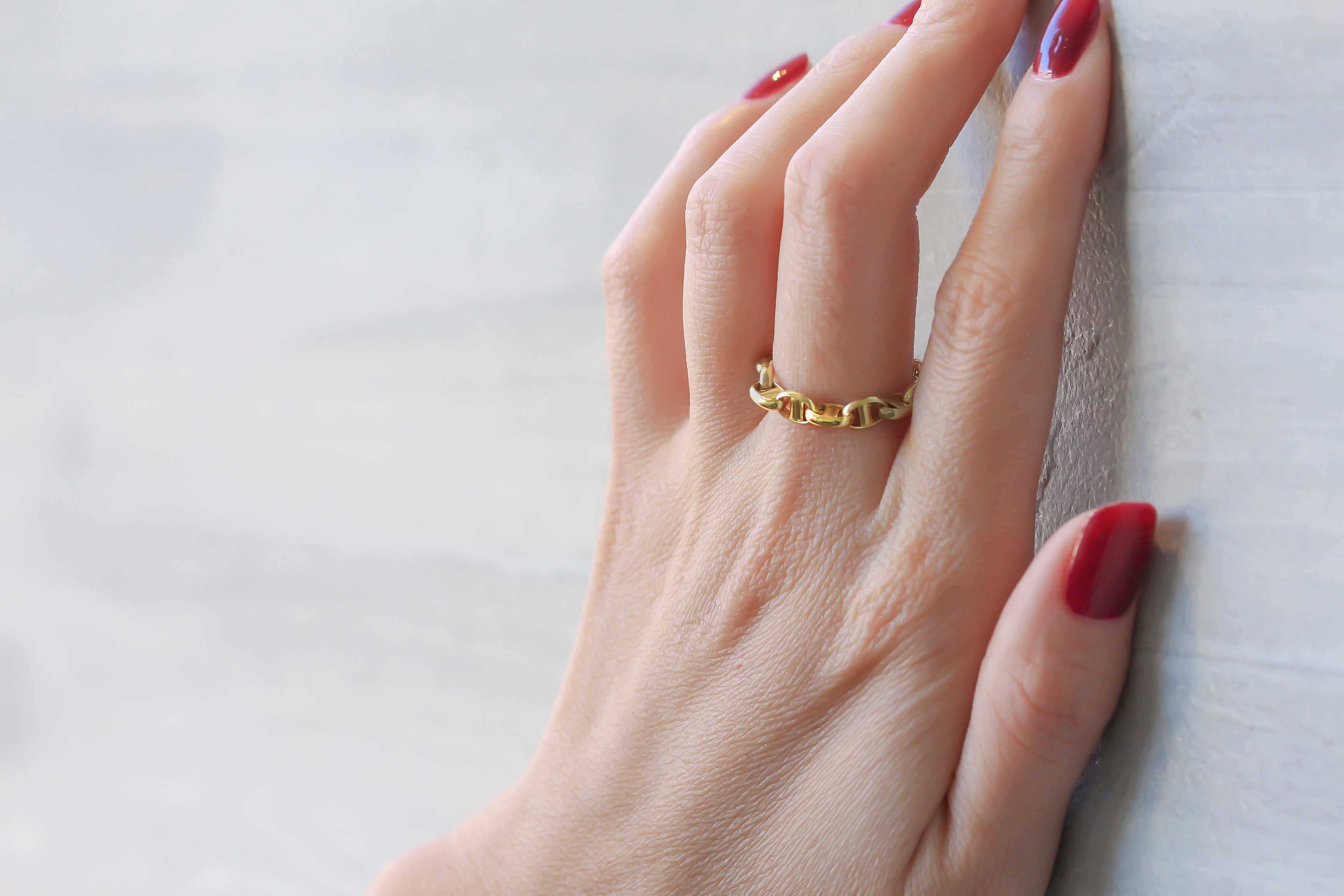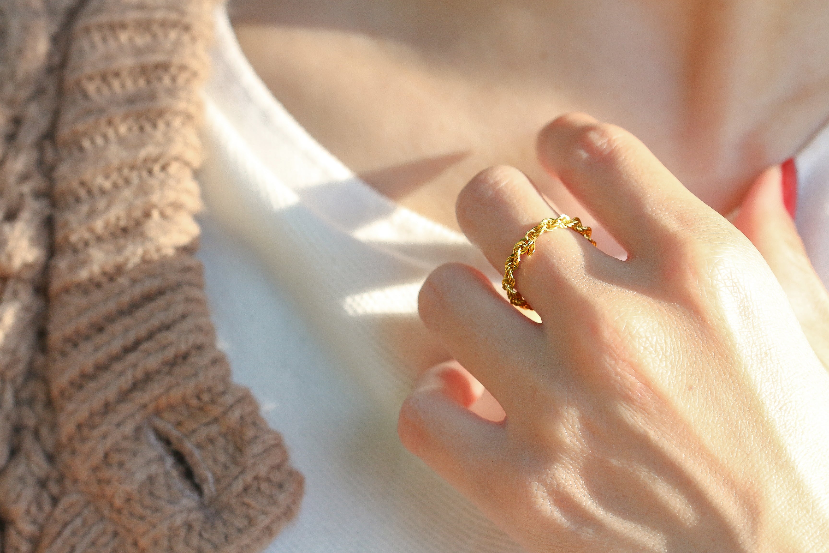 存在感がありながら自己主張しないチェーンリングは、リングの重ね付けやブレスレットとの組み合わせなど、他のファッションアイテムを引き立てます。