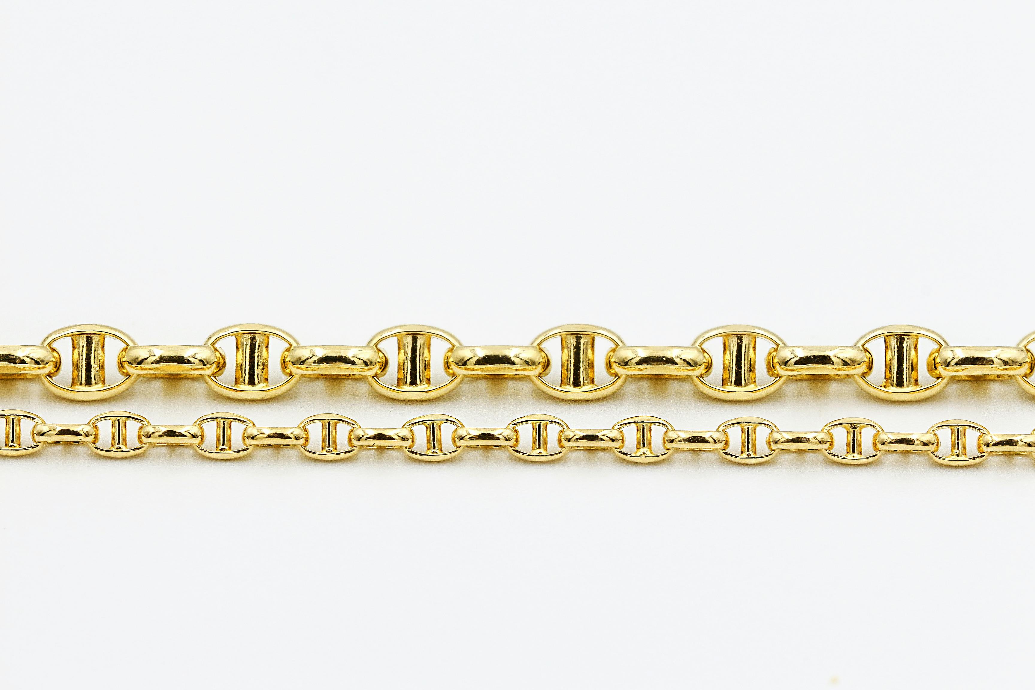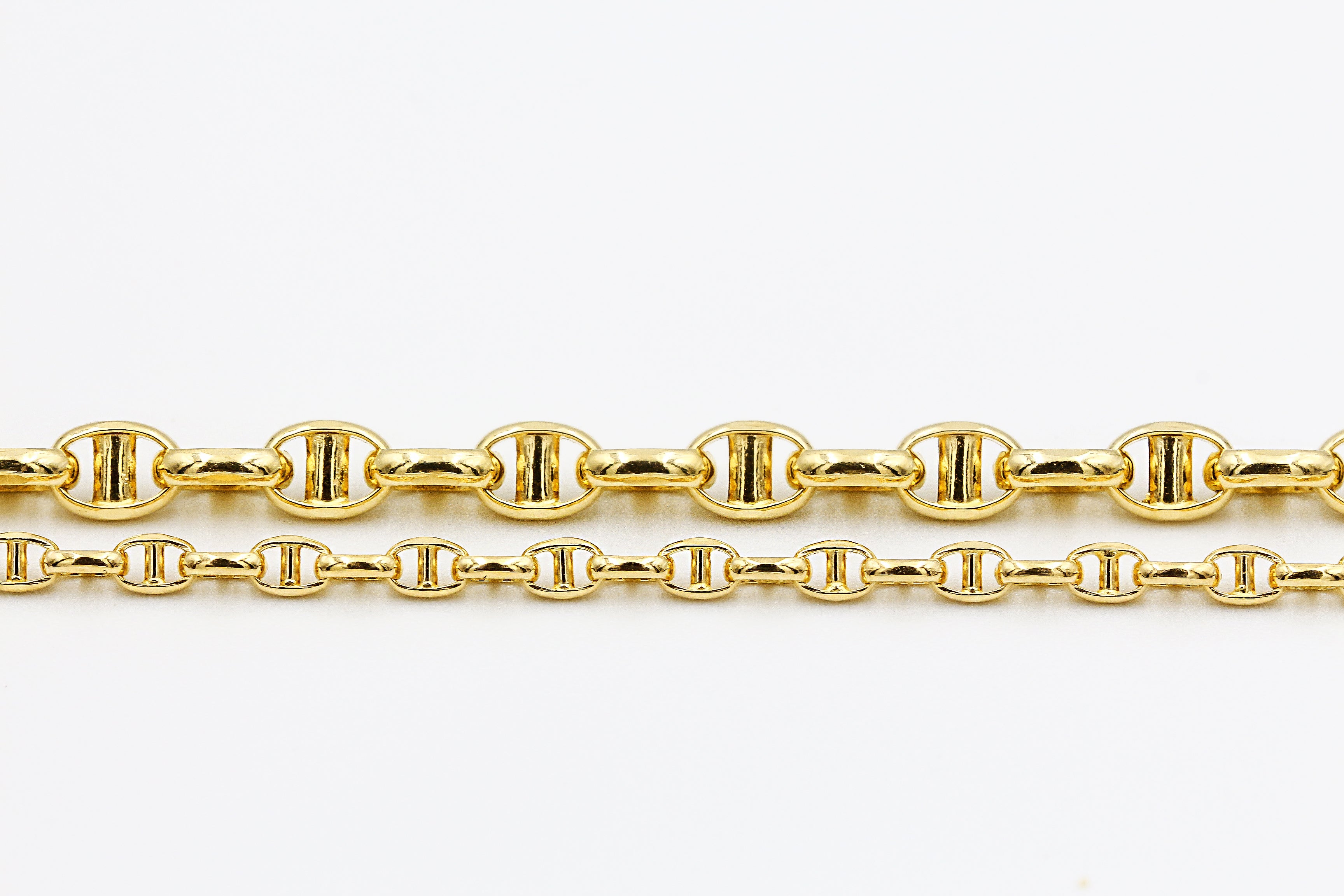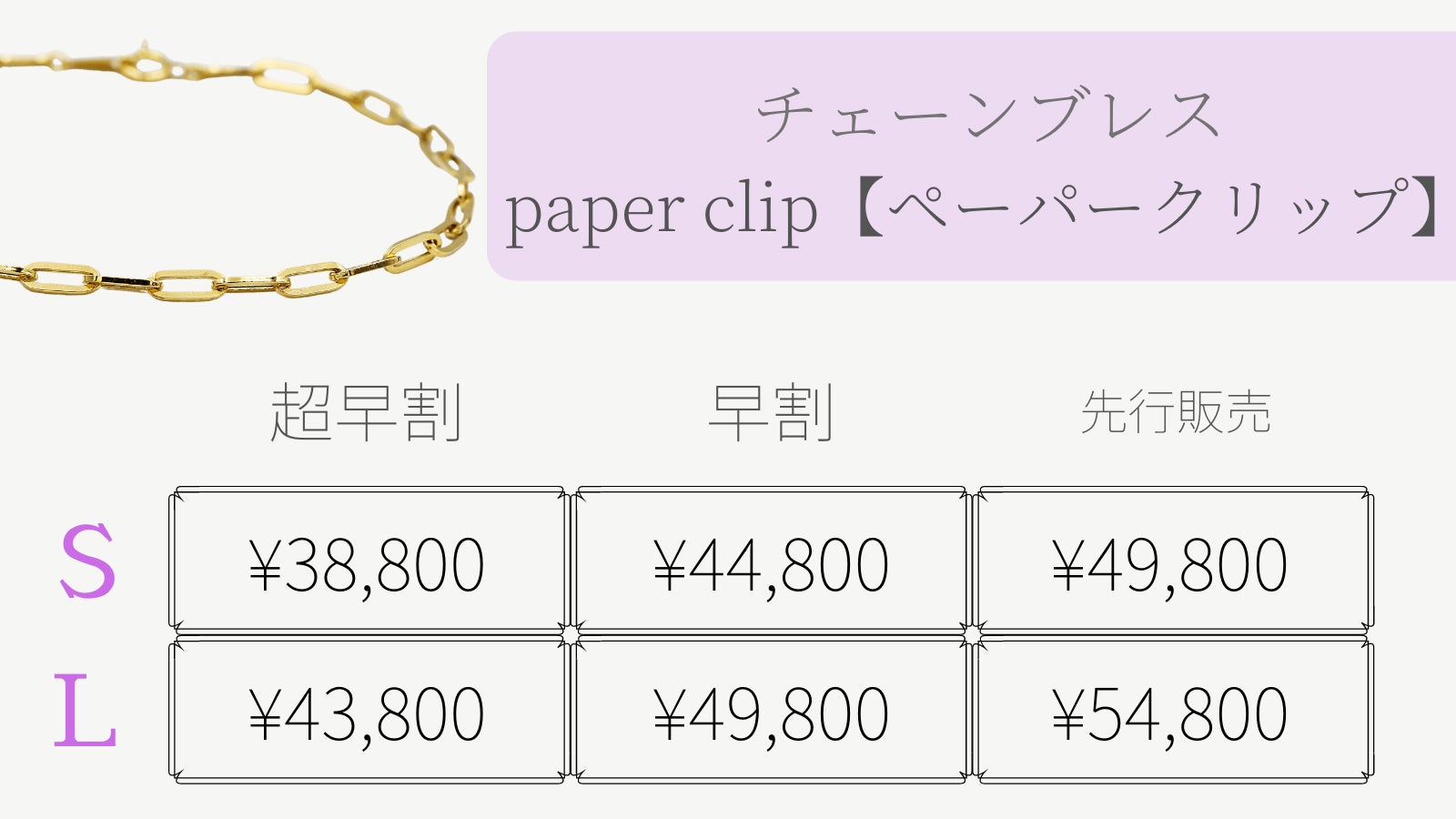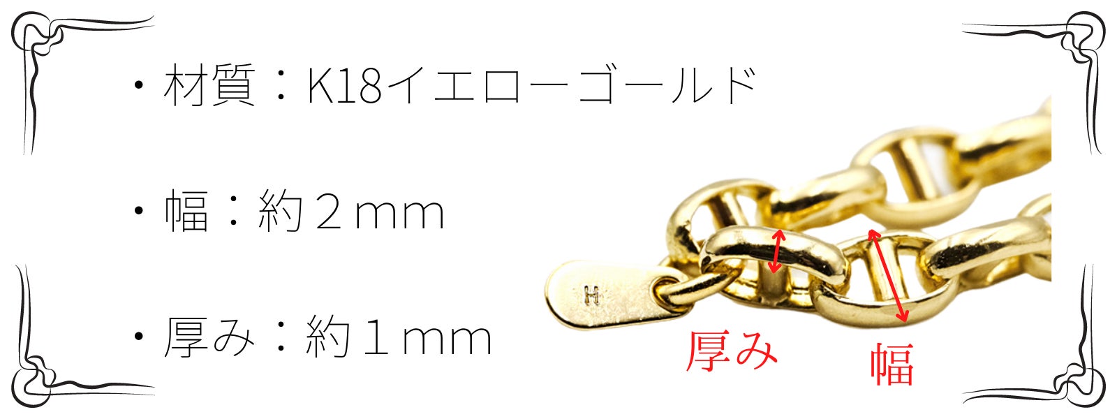 ペーパークリップタイプは、他のチェーンに比べて光に当たった時の反射面が大きくゴールドならではの輝きとリッチな雰囲気を存分に味わう事が出来ます。