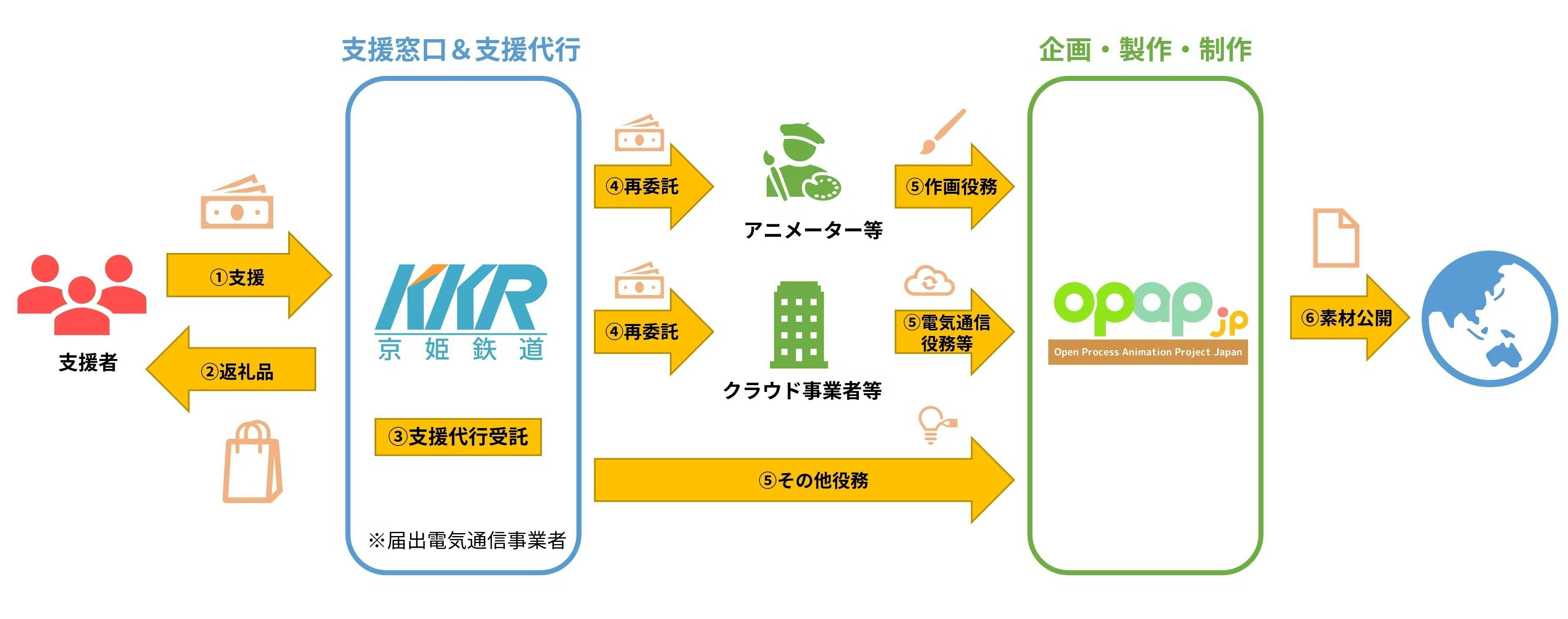 1. ご支援金は京姫鉄道合同会社が受領し、京姫鉄道合同会社の会計内で処理いたします。オープンプロセスアニメプロジェクトジャパン(以下、OPAP-JP)に対しては、「支援スキームについて」に記載の通り、京姫鉄道合同会社が皆様に代わって役務を提供する「支援代行」の形で支援を行います。したがって、本プロジェクトの支援はOPAP-JPの収益とはなりませんのでご留意ください。(OPAP-JPへの直接支援につきましては、OPAP-JPにお問い合わせください)