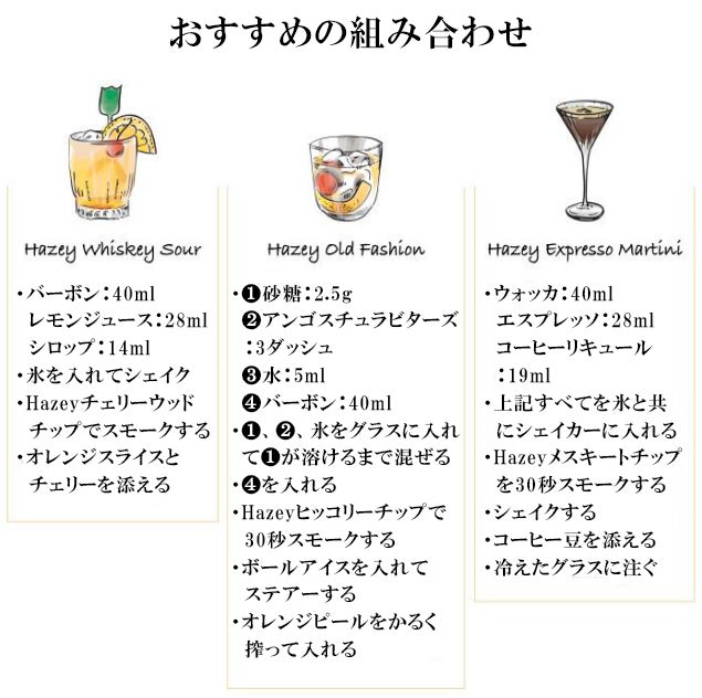 手軽に特別なフレーバーのウイスキーが楽しめるスモークカクテルキット「HAZEY」がついに日本上陸! リターン品の配送が完了するまで、Ys-tradingはHazeyの日本における独占販売権を有する正規代理店です。詳細に関しては、ページ下部のリスク&チャレンジをご確認ください。