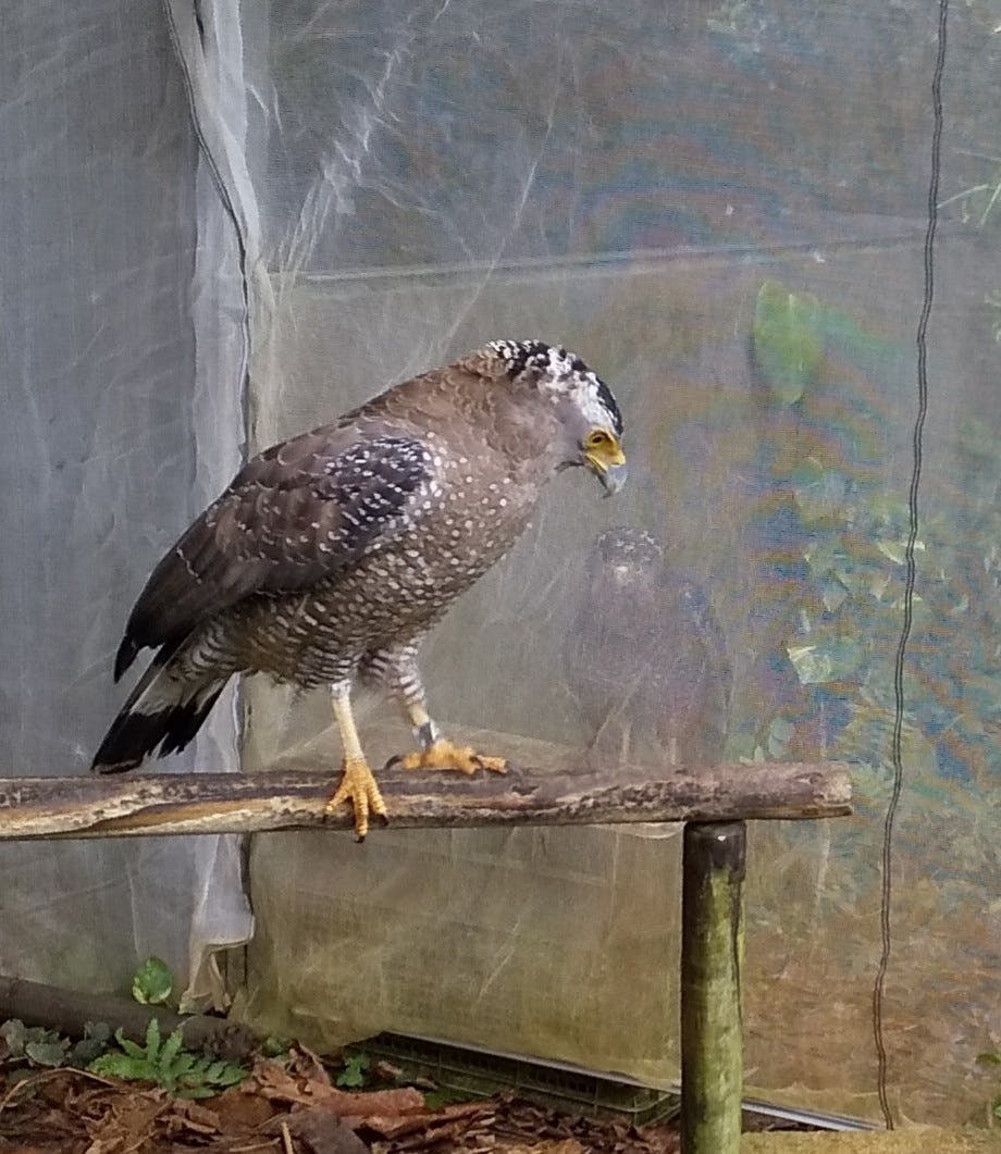 2羽のカンムリワシが写るこの画像が、リハビリケージのひっ迫度と、ケージの必要性を物語っています。(手前がよんなー(終生飼育個体)、奥がリハビリ中のカンムリワシ)