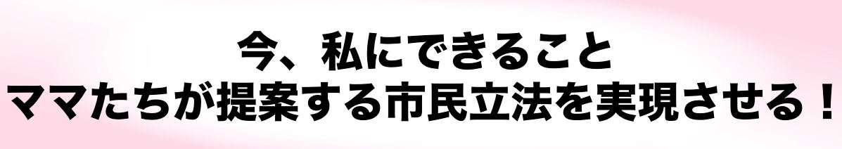 同時に、関係省庁や地方行政へ答申(要望書のようなもの)を渡し、法律やまちのルールの中に、ママの意見を取り入れていただく、市民立法を行えるようにしていきたいです。