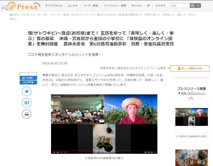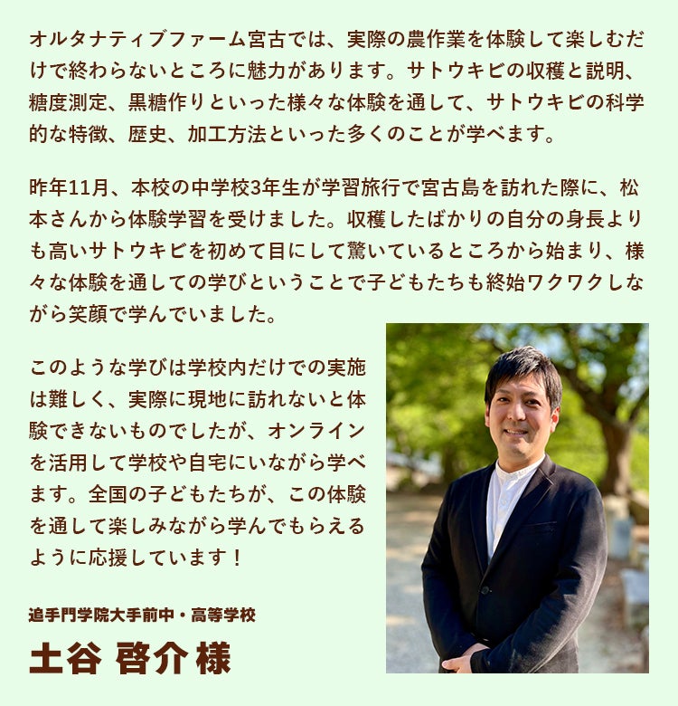 こんにちは、オルタナティブファーム宮古の松本です。ついに開始しました。本日で3日目。既にご支援いただきました皆様、誠にありがとうございます!プレスリリースも出させていただきました。畑(サトウキビ)~食卓(お砂糖)まで! 五感を使って「美味しく・楽しく・学ぶ」食の循環 沖縄・宮古島から全国の小学校に 「体験型のオンライン授業」を無料開催 農林水産省 第6回食育活動表彰 消費・安全局長賞受賞プロジェクト期間中は農園をライブ中継でご案内したりちょっとしたイベントも考えておりますので是非温かく見守って頂けますと嬉しいです!どうぞよろしくお願いします!