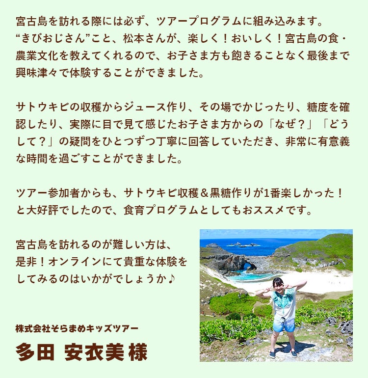 株式会社そらまめキッズツアー多田安衣美様より応援メッセージを頂きました!ありがとうございます!子どもたちに様々な体験や経験を通して夢と感動を与え続けるそらまめキッズツアーさん、私もそのお手伝いが出来て嬉しいです(^^)私も負けずに沢山の子どもたちにサトウキビを通じて楽しく食育届けて参ります!