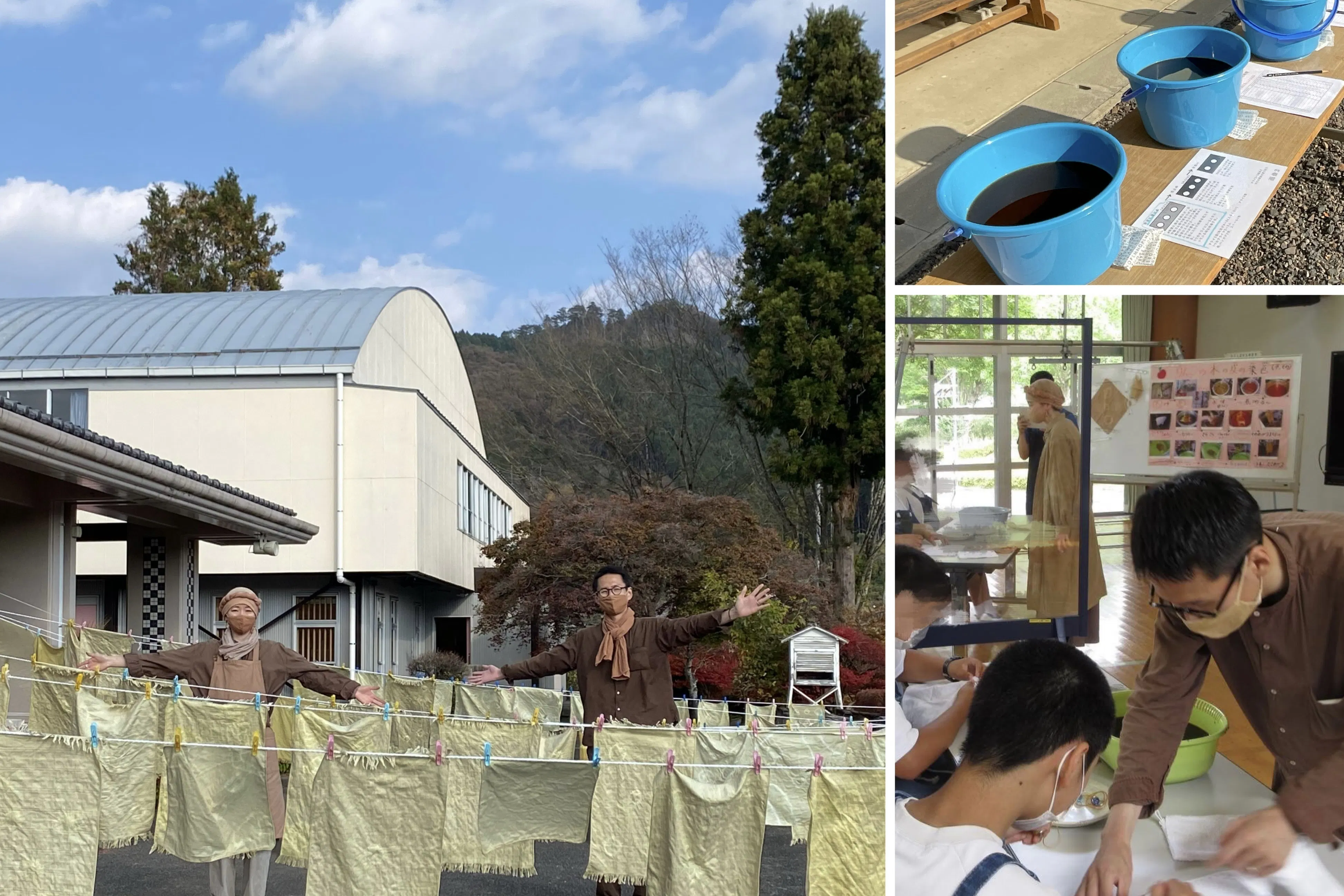 学校で作った野菜の葉などで実際に染色体験を行い、資源を無駄なく大切に活用する取り組みを伝えています。
