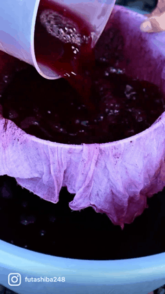 2022/07/24 09:38こんにちは。フタシバの関です。先日、都内でのPOPUP SHOPを終えて茨城県に戻ってきました。毎日、暑い日が続いていますね。工房の作業場には冷房が無い為、こまめに休憩をとったり夕方から作業を始めるなど夏バテ・熱中症に気をつけて作業をしています!リターン用Tシャツを染める為にブルーベリーを煮込みました。煮込み作業を始めるとますます室温が上がりとても暑いです!煮込んだブルーベリーは少し冷まして濾していきます。ブルーベリージュースみたいで美味しそうですよね!とても良い香りです。次回は染色作業。Tシャツの発送までもうしばらくお待ちくださいませ。 もっと見る