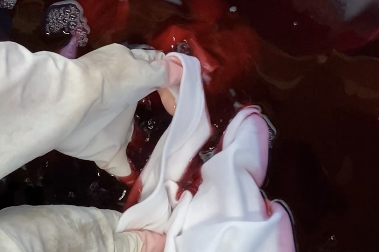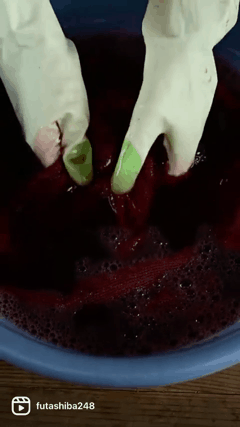 2022/07/26 11:36こんにちは。リターン用Tシャツをブルーベリーで染めました。白いTシャツに色が入っていく瞬間はとても気持ちがいいです!綺麗なピンク色でブルーベリーの甘い香りが漂います。染液の中でよく揉み込み30分ほど浸します染液につけたら次は媒染という色止めの作業です!今回はアルミを使用しています。ブルーベリーは下地をアルカリ性で処理すると色がだんだんと赤紫〜青紫〜青緑に変化していきます!不思議ですよね!今回は青味寄りの深緑色に染め上がっております。タグをつけて順次発送させていただきますのでご到着を楽しみにお待ちくださいませ。 もっと見る