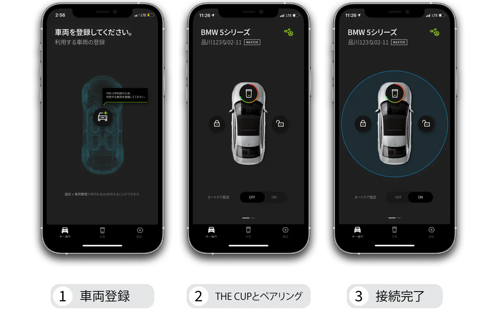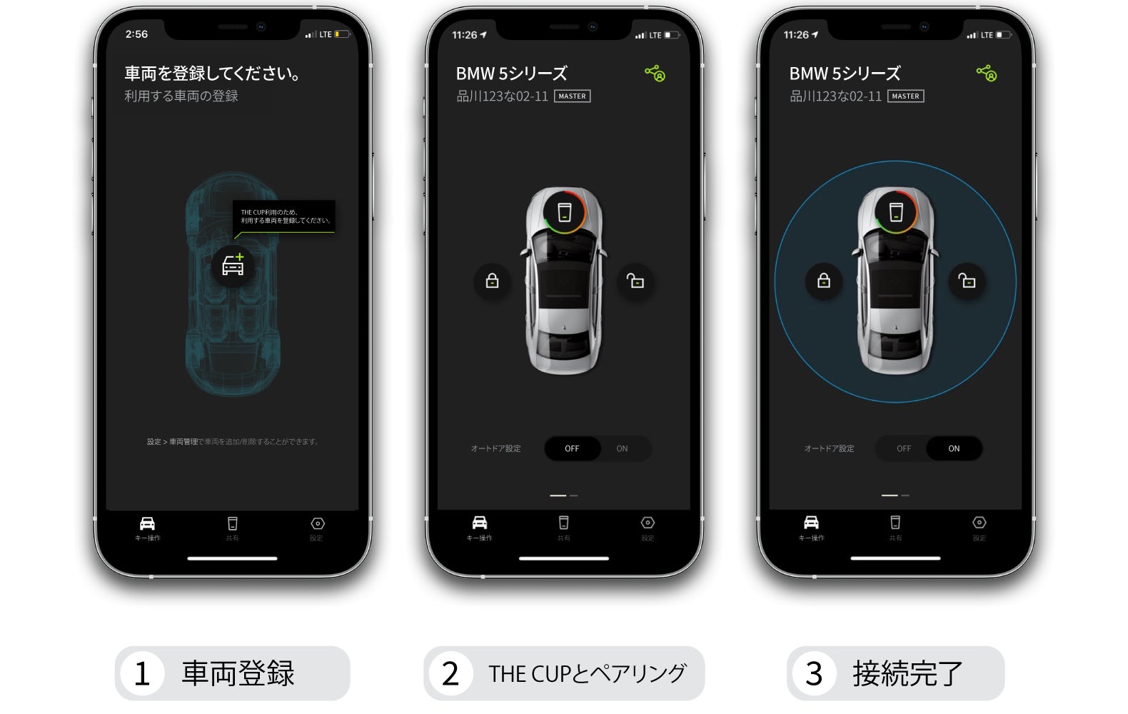 ❹スマートキーが装着されているTHE CUPと専用アプリを連携させ