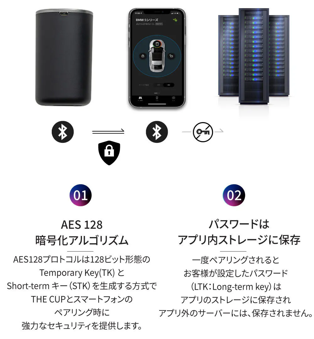 ペアリングのパスワードを暗号化した上で、不正アクセスの恐れがあるサーバーではなく、スマートフォン本体に保存する二重セキュリティ方式を採用しています。