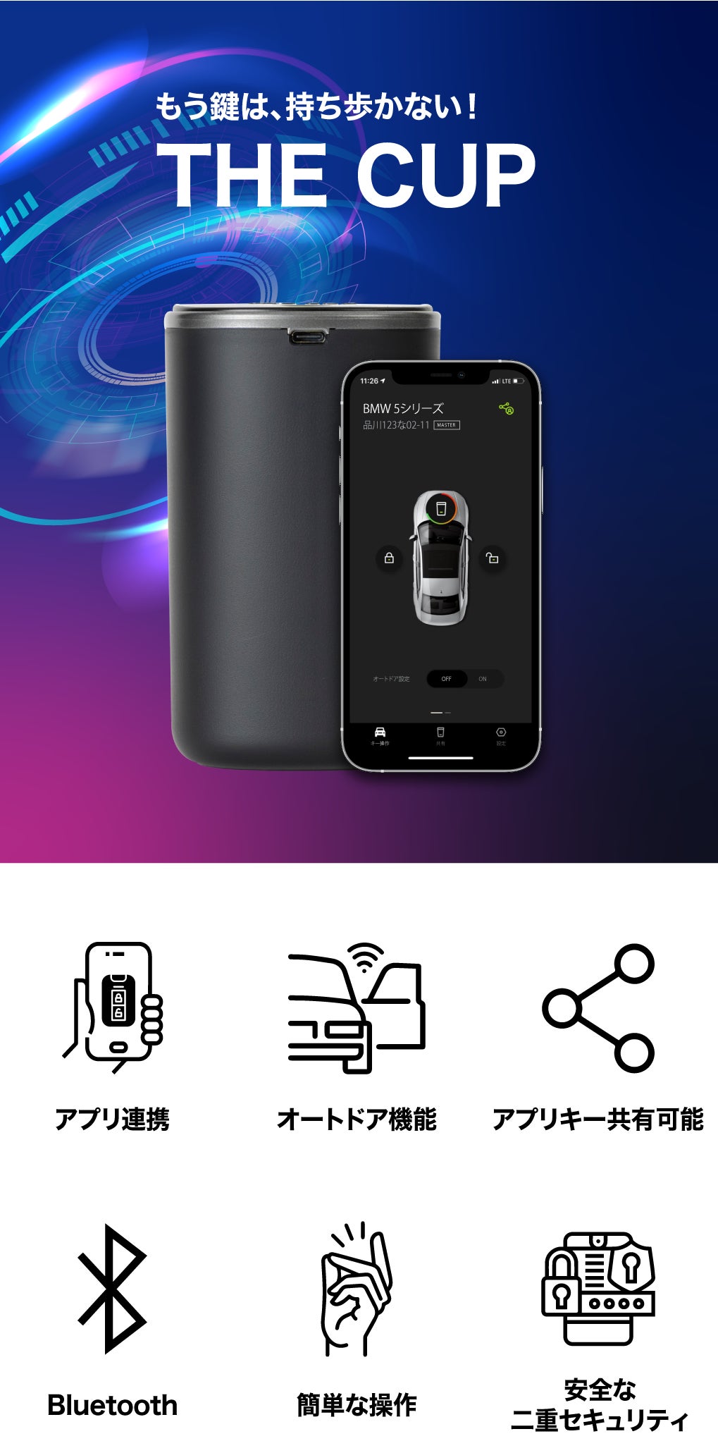 ●THE CUPは、Bluetooth通信を利用し、物理的にスマートキー操作を行う機械です。