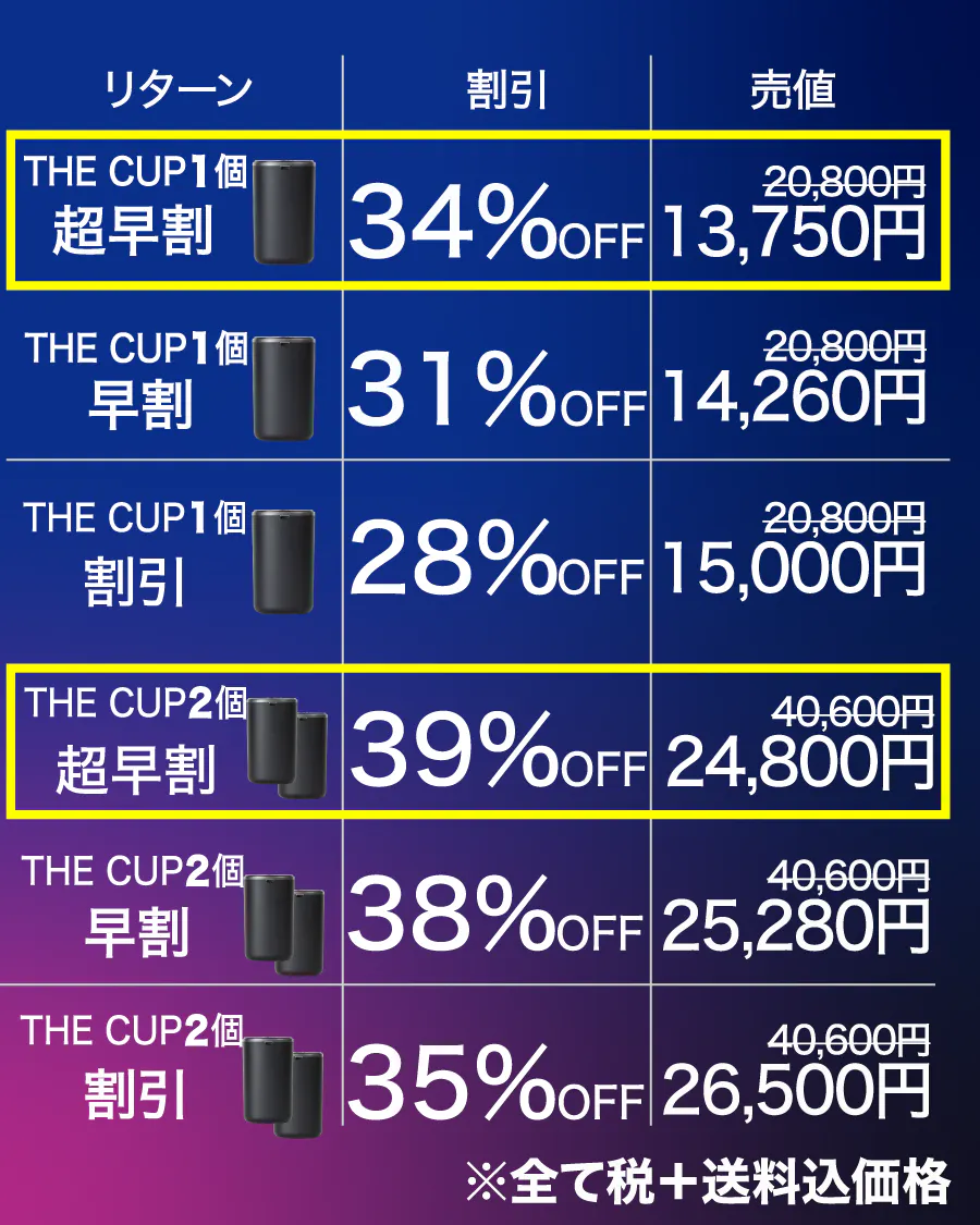 しかし!THE CUPなら、(超早割価格)13,750円(税+送料込み)で充電しながら持続的に利用できます。