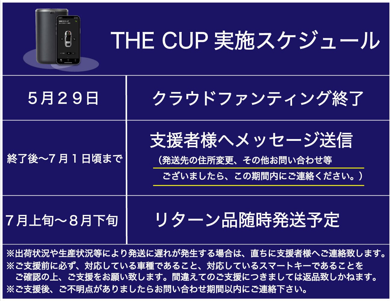 2022/05/29 00:00こんにちは!ジェービエス株式会社です。車の次世代型デジタルキー「THE CUP」プロジェクト本日最終日です!あなたは車の鍵を無くしたことありませんか?車の鍵を持ち出すのを忘れたり、家族に渡し忘れたりしたことはありませんか?こんなトラブルを解決するのが「THE CUP」です!「THE CUP」はご利用されている車の車種・スマートキーが製品に対応していれば納品後すぐ、簡単にご利用いただけます。皆様たくさんのお問い合わせありがとうございます!!本日、プロジェクト最終日です!少しでも、興味をお持ちでしたらぜひ一度ご検討ください!●ご支援を検討されている方へ本日ご支援受付最終日です。ぜひ、この機会にご支援よろしくお願い致します!本プロジェクトリターン品は、今回だけの限定価格となっております!本日にてプロジェクト終了!皆様のご支援・応援、最後までよろしくお願い致します。ご支援いただく前に、一度ご利用可能車種・スマートキー一覧をご確認ください。●メールにてお問い合わせされる場合「ご利用中の車種・年式」「スマートキーの写真or画像」を記載していただきお問い合わせいただくと大変スムーズにご案内ができます。また、利用の際に心配なことや不安なことなど、ご遠慮なくお問い合わせください。digitalkey@jbs-japan.comこちらまで、必要事項明記の上お問い合わせください。●ご利用対応車種について・TOYOTA ・LEXUS ・NISSAN ・BMW ・AUDI ・M.BENZ上記は、対応している車種がある6社になります。ぜひ、ご自身のスマートキーを確認してみてください。※一覧表に載っていない形や、ボタンの数でも対応している場合がありますので一度お問い合わせください。●一覧表に記載のない車種について上記に記載のない車種については、申し訳ありませんが非対応となっております。しかし!今秋にHONDA社のスマートキーに対応したTHE CUPが開発・販売予定となりました!気になっているけどスマートキーが対応していないかも...と思われた支援者の皆様もぜひ一度お問い合わせください。ご希望でしたら、正式に販売日が決まりましたらご案内させていただきます。(社会情勢・半導体不足・材料費価格高騰が著しいため販売日等は未定です。)●ご支援いただいている皆様へこの度はご支援いただき誠にありがとうございます。本日プロジェクト最終日となりました。皆様からのご支援、そしてクチコミのおかげもありご支援ご希望の方からたくさんのご連絡をいただきました。今回、残念ながら非対応だったお知り合いの方などおられましたら今後とも応援いただけますよう伝えくださいませ。最後まで応援よろしくお願い致します。最終日ですがまだ間に合います!皆様のご利用されている、SNSやクチコミ等で本プロジェクトを宣伝していただけますと幸いです。https://camp-fire.jp/projects/view/569895よろしくお願い致します。ジェービエス株式会社 もっと見る