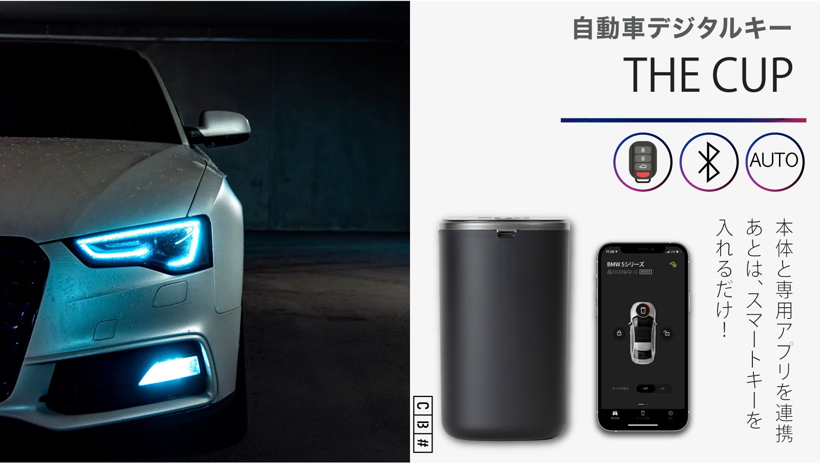 従来からある「鍵」を持ち歩くのではなく、THE CUPと専用アプリをスマートフォンにインストールし、デジタルデータを利用して正しい利用者を認識し、車の鍵の施錠・解錠を正しく・確実に行うことができる次世代型の鍵をデジタルキーと呼んでいます。