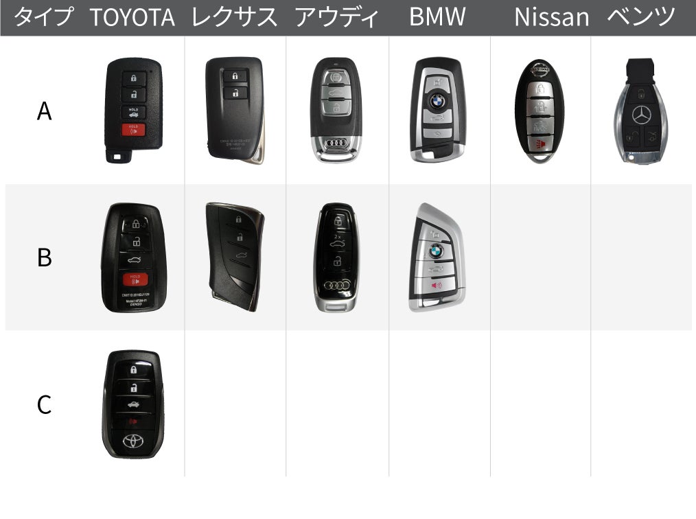 車の車種や、年式、オプションなどによってスマートキーの形状やボタンの位置、数など異なる場合がありますので、ご心配な方・支援を検討されておられる方は